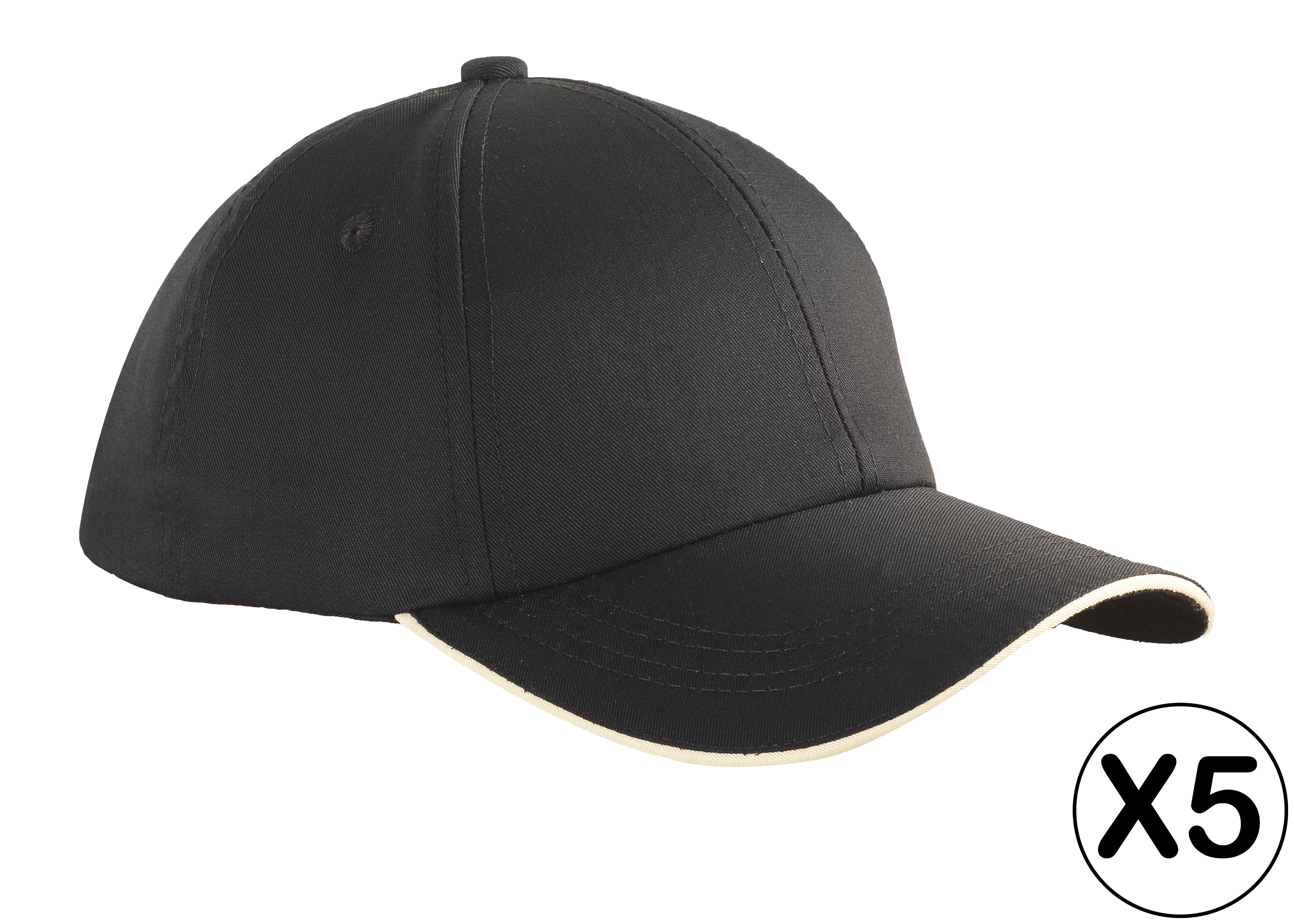 Casquette à visière 6 pans Liseré contrasté sur devant de visière La visière fait 7 cm Fermeture par scratch au dos Lavable en machine Uniquement en lot de 5