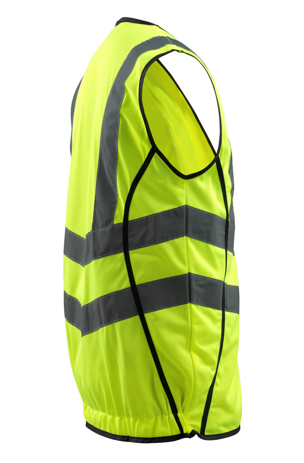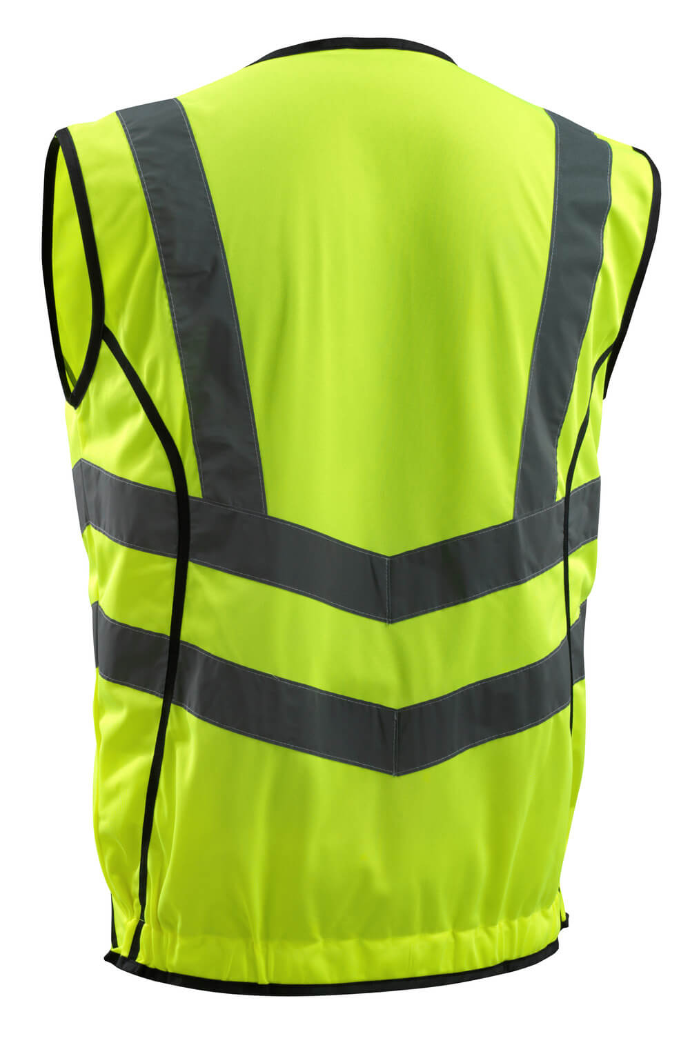 Fluorescent(e) avec bandes rétroréfléchissantes transversales, verticales et en biais. Zip intégral. Poche intérieure. Bord ruban. Taille large - conçu pour être porté au-dessus des autres vêtements.