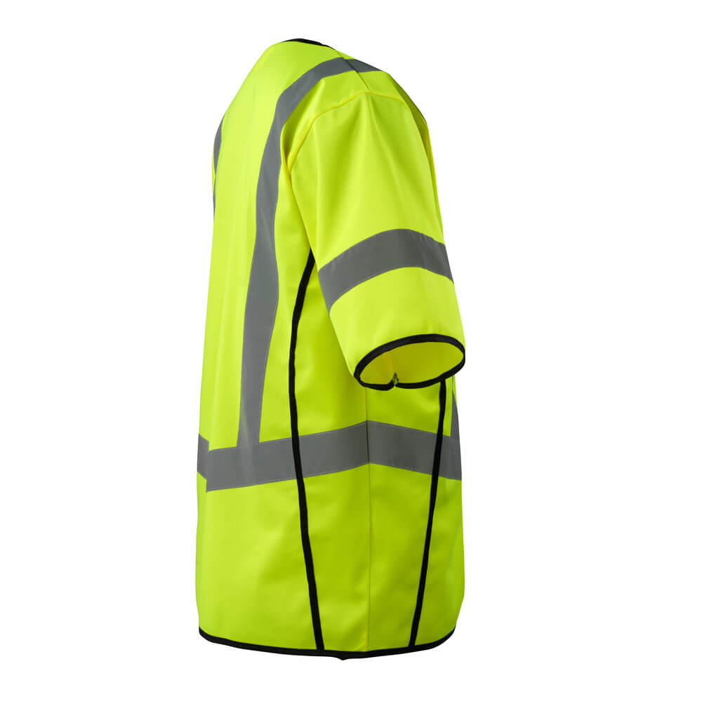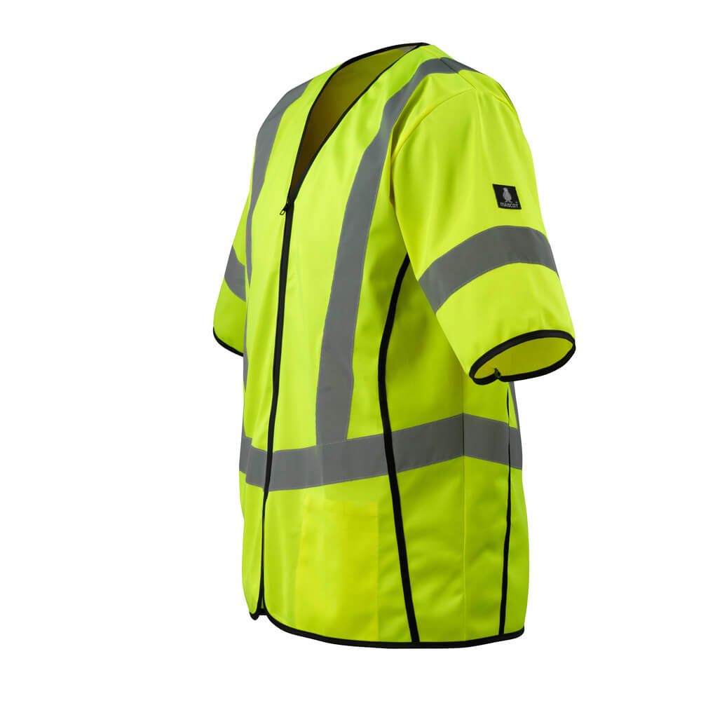 Tissu fluorescent avec bandes rétroréfléchissantes horizontales et verticales. Zip intégral. Poche intérieure. Bord ruban. Taille large - conçu pour être porté au-dessus des autres vêtements.