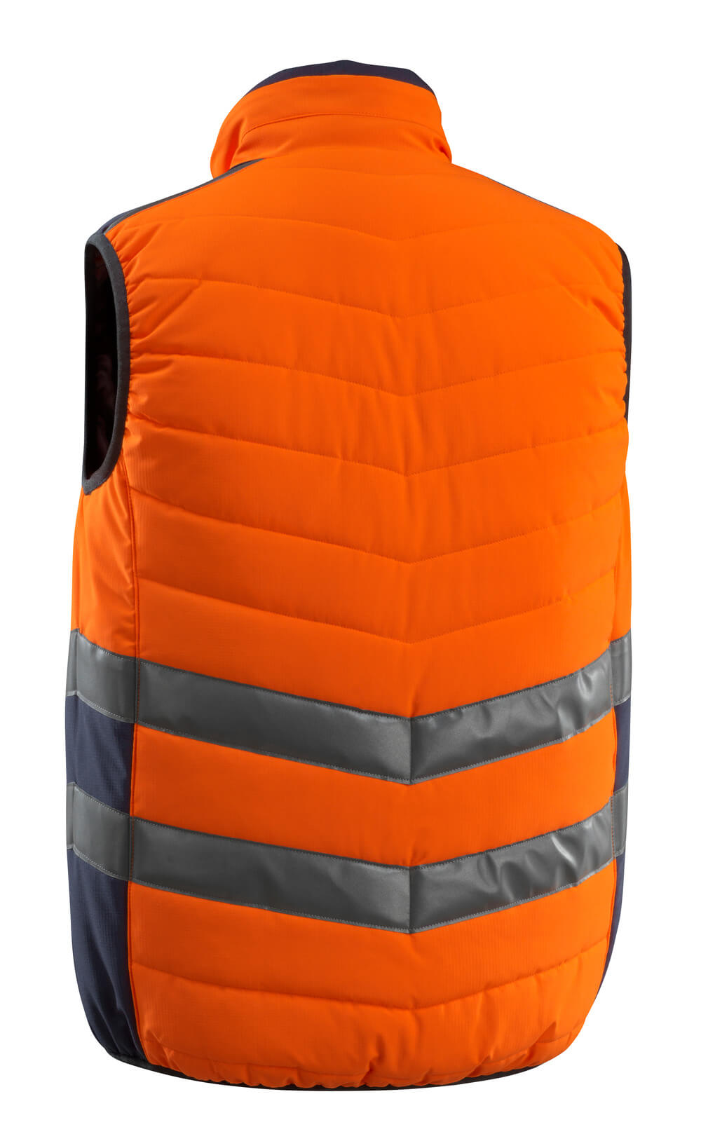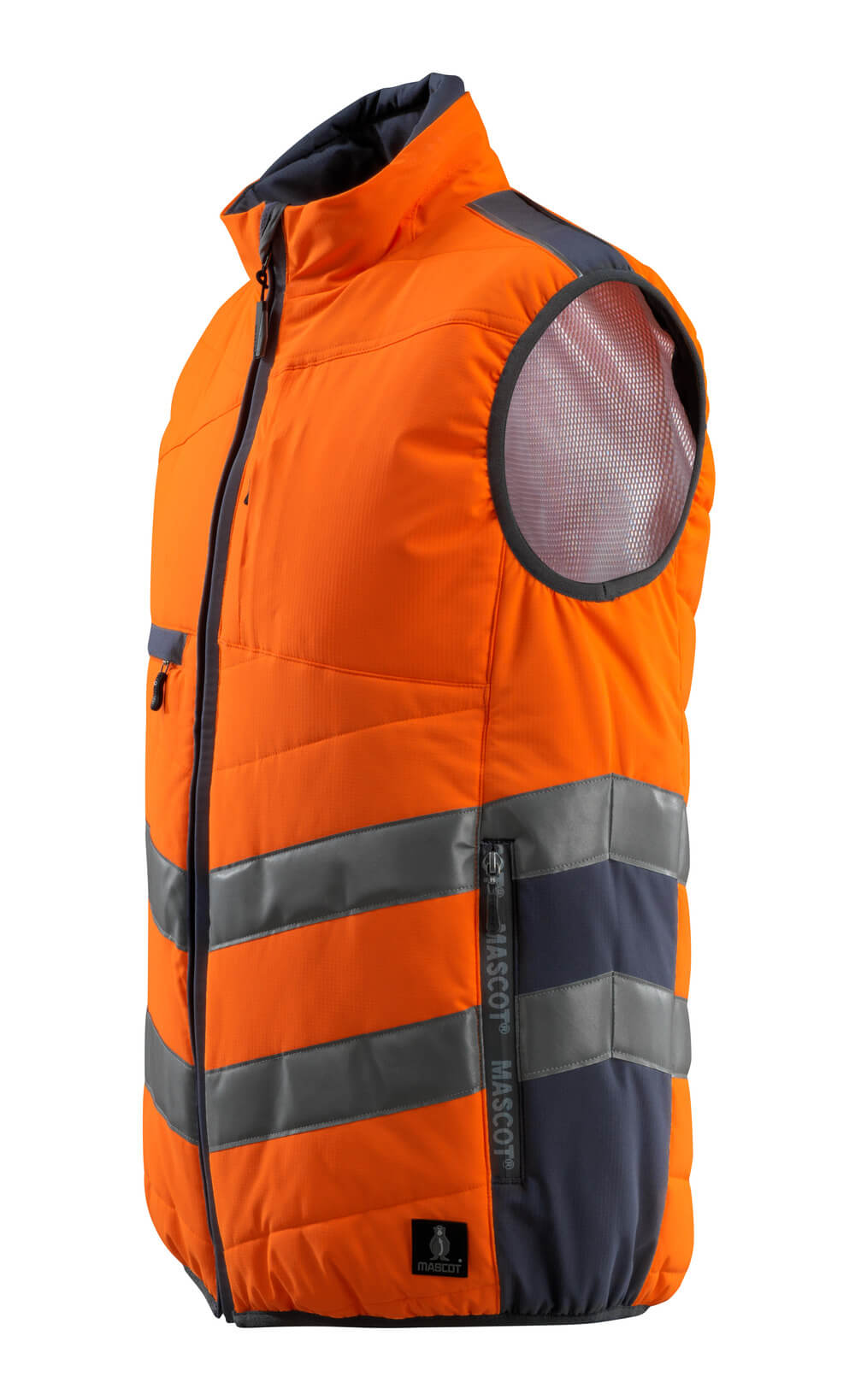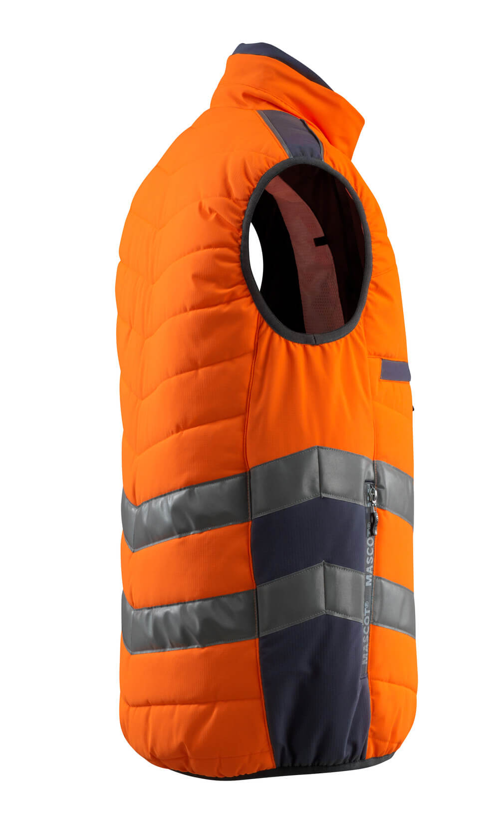 Fluorescent(e) avec bandes rétroréfléchissantes transversales en biais. Bicolore. Coupe-vent, hydrofuge et permettant au corps de respirer. Rembourré avec du polyester. Fermeture zippée et rabat coupe-vent à l'intérieur. Col montant. Poche intérieure zippée spécialement conçue pour le téléphone avec des trous pour les écouteurs et des boucles pour maintenir les câbles. Poches poitrine zippées. Anneau en D. Poches latérales zippées.