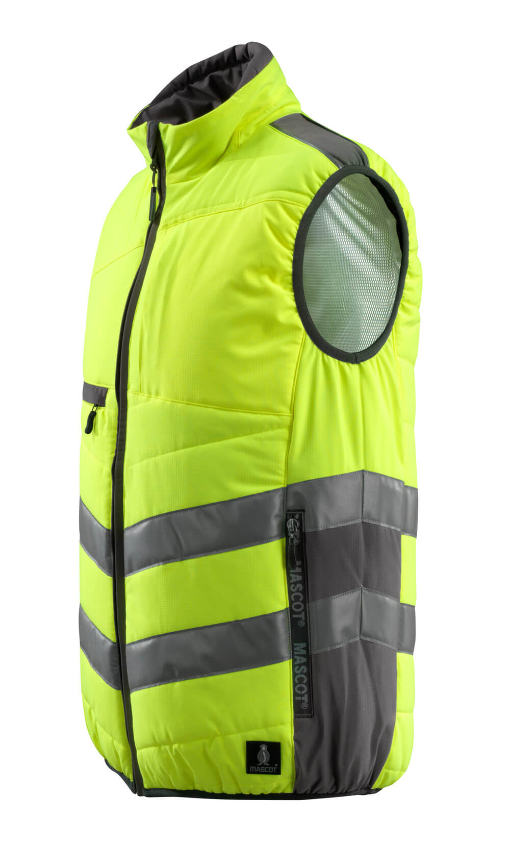Fluorescent(e) avec bandes rétroréfléchissantes transversales en biais. Bicolore. Coupe-vent, hydrofuge et permettant au corps de respirer. Rembourré avec du polyester. Fermeture zippée et rabat coupe-vent à l'intérieur. Col montant. Poche intérieure zippée spécialement conçue pour le téléphone avec des trous pour les écouteurs et des boucles pour maintenir les câbles. Poches poitrine zippées. Anneau en D. Poches latérales zippées.