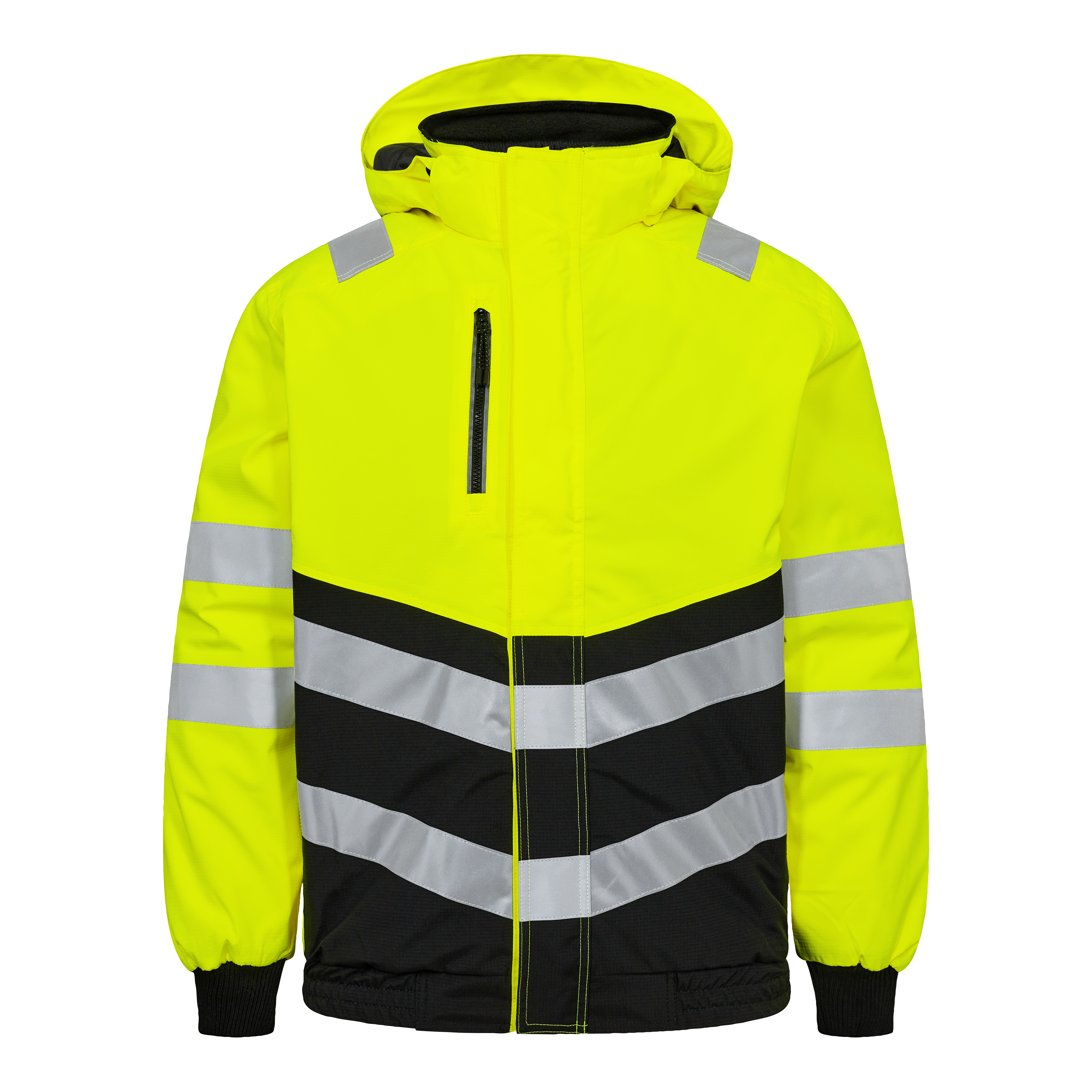 Blouson aviateur fluorescent respirant, hydrofuge et coupe-vent avec coutures soudées, encolure haute et coupe moderne. Double patte de boutonnage avec fermeture à glissière et fermeture velcro sur le devant. Deux spacieuses poches latérales et une poche poitrine avec une fermeture à glissière. Deux poches intérieures, dont une avec fermeture à glissière. Capuche amovible avec possibilité de réglage et adaptée pour le casque de travail. Élastique en bas et bord côte aux poignet. Fermeture à glissière dans la doublure pour y appliquer une impression/broderie. Des bandes réfléchissantes sur les épaules, ainsi qu’autour des bras et de la taille. Classe de vêtement 3. Testé après 50 lavages.