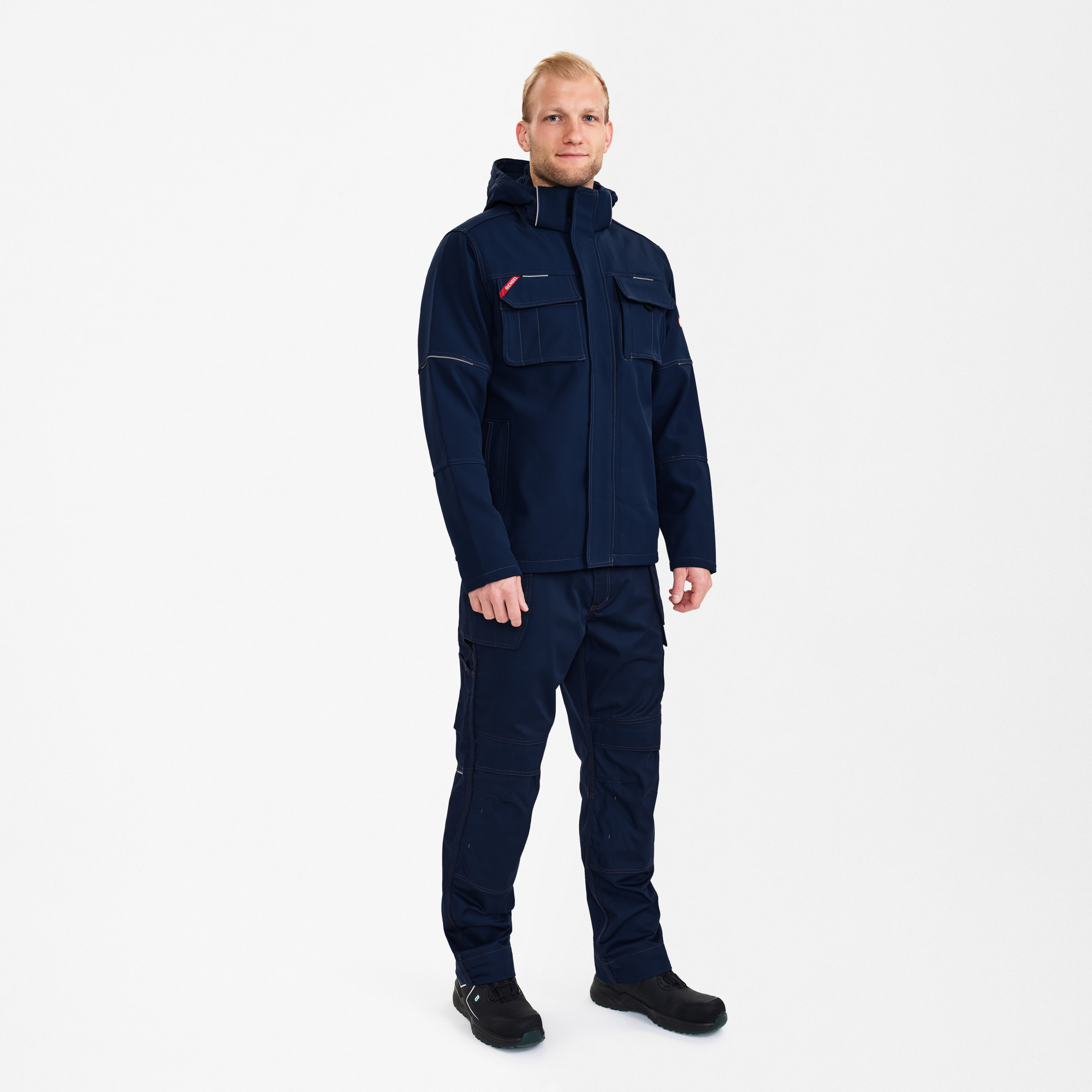 Blouson softshell fonctionnel avec piqûres contrastées. Fermeture à glissière dissimulée et boutons pression sur le devant. Molleton doux à l’intérieur du col. Deux grandes poches repose-mains sur le devant. Deux poches poitrine à rabat et fermeture à pression dissimulée. La poche de droite comporte une poche pour portable et fermeture velcro ainsi que deux poches stylo. La poche de gauche comprend une poche passepoilée avec fermeture à glissière ainsi qu’une attache avec anneau en D et une poche supplémentaire avec une partie pour outil et en plus une bride pour outil. Coupe-vent à l’intérieur des manches. Capuche amovible avec velcro. Le blouson comporte un passepoil réfléchissant pour être mieux vu.