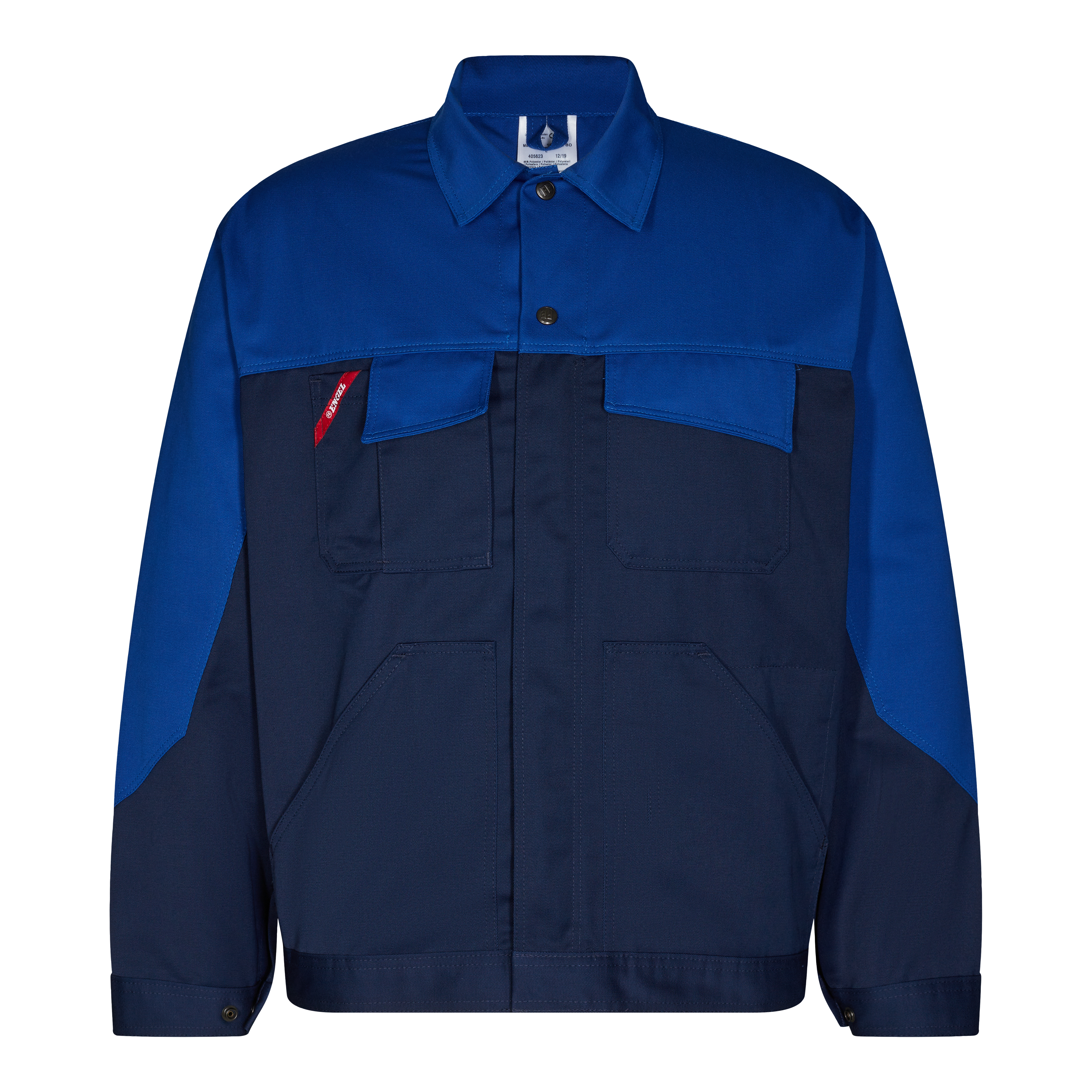 Blouson court bicolore zippé, deux poches repose mains, deux poches poitrine: une pour portable à droite et une grande à gauche. Poche intérieure. Taille réglable. Renfort sur les épaules et les manches. Supporte un lavage industriel.
