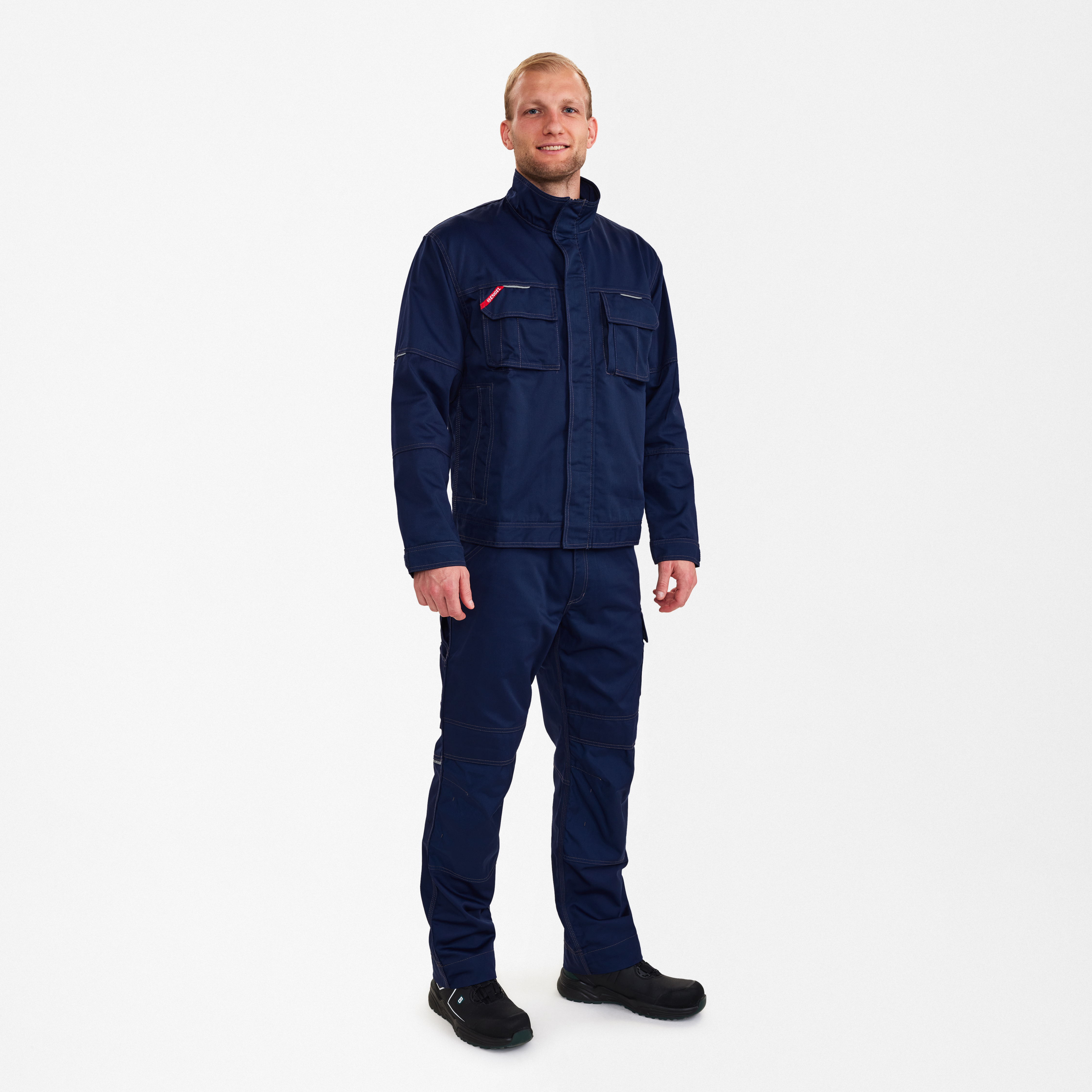 Blouson de travail fonctionnel avec piqûres contrastées. Fermeture à glissière sous patte et fermeture velcro sur le devant. Deux grandes poches repose-mains sur le devant. Deux poches poitrine à rabat et fermeture velcro sous patte. La poche poitrine droite possède plusieurs poches dont une poche stylos. La poche de gauche comprend une poche passepoilée avec fermeture à glissière ainsi qu’un anneau en D et une poche supplémentaire avec séparation pour les outils. Poches intérieures avec fermeture velcro. Bandes réfléchissantes.