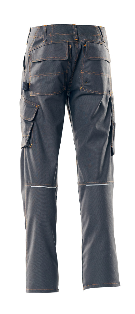 Coutures doubles sur les jambes et triples dans l'entrejambe. Taille basse et ceinture façonnée. Jambes ergonomiques. Passants de ceinture. Braguette zippée. Poches latérales. Poches arrière renforcées, sous rabat avec fermeture par bande auto-agrippante. Patte-marteau réglable. Poche cuisse renforcée, avec poche téléphone et rabat avec fermeture par bande auto-agrippante. Poche pour mètre pliant renforcée, avec une petite poche superposée. Poche stylo. Coutures contrastées orange. Effets rétroréfléchissants.