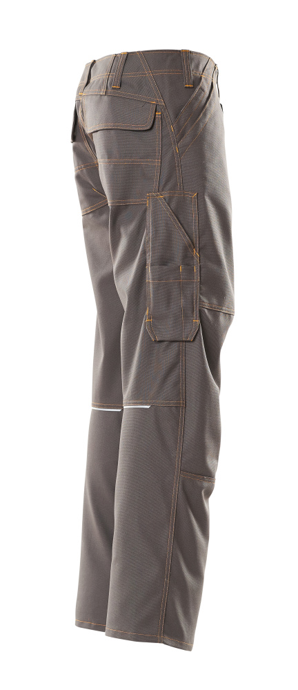 Coutures doubles sur les jambes et triples dans l'entrejambe. Taille basse et ceinture façonnée. Jambes ergonomiques. Passants de ceinture. Braguette zippée. Poches latérales. Poches arrière renforcées, sous rabat avec fermeture par bande auto-agrippante. Patte-marteau réglable. Poche cuisse renforcée, avec poche téléphone et rabat avec fermeture par bande auto-agrippante. Poche pour mètre pliant renforcée, avec une petite poche superposée. Poche stylo. Coutures contrastées orange. Effets rétroréfléchissants.