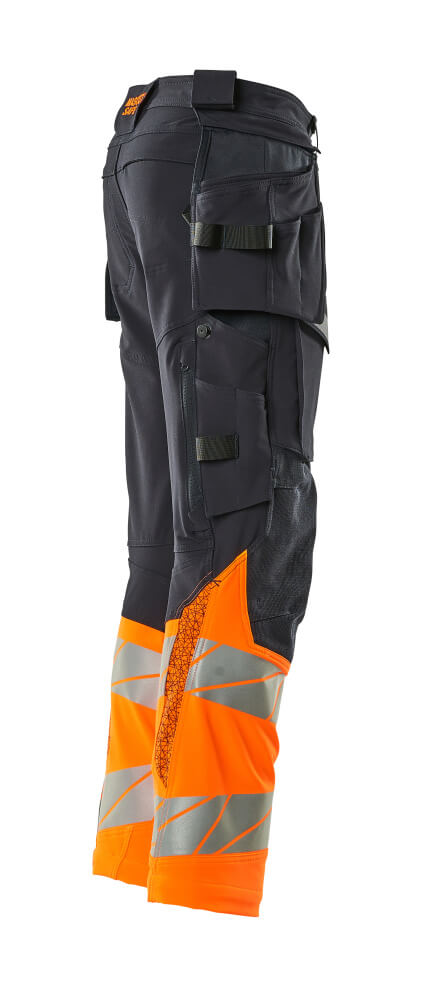Couleur fluorescente et contrastée avec bandes rétroréfléchissantes. Offre une finition hydrofuge. Bicolore. Tissu ultimate stretch de poids léger et résistant. Coutures doubles sur les jambes et dans l'entrejambe. Fermeture bouton dissimulée. Jambes ergonomiques. Poches flottantes amovibles. Poche flottante interne fermeture avec boutons-pression. Poche flottante avec poche téléphone doublée et fermeture aimantée. Poches flottantes avec renforts en Kevlar® et CORDURA®. Passants de ceinture. Patte-outils de chaque côté de la taille. Braguette zippée. Poches latérales. Poches arrière renforcées et rabat. Patte-marteau cachée de chaque côté. Bouton (amovible) où fixer un porte-couteau. Poche mètre pliant renforcée en Kevlar®. Poches à rabat à l'avant des cuisses. Poches genouillères en CORDURA® de tissu stretch avec ventilation. Réglage facile de la hauteur de la poche genouillère. Poche cuisse avec poche téléphone doublée, fermeture aimantée et porte-badge intégré. Porte-badge amovible. Zip de ventilation vertical à l'arrière des cuisses. Avec effets d'impression. Longueur d'entrejambe pouvant être rallongée de 3 cm en défaisant la couture rouge à l'intérieur vers le pied. Double certification compatible avec le modèle de genouillères large selon la norme EN 14404-3.