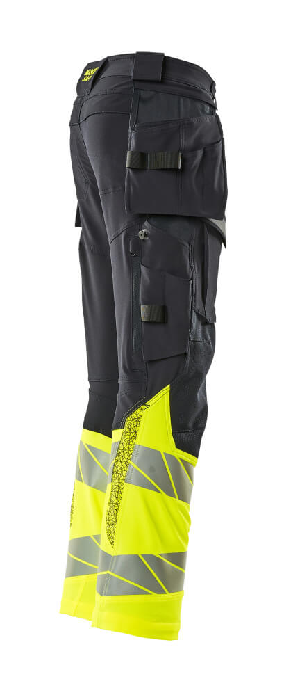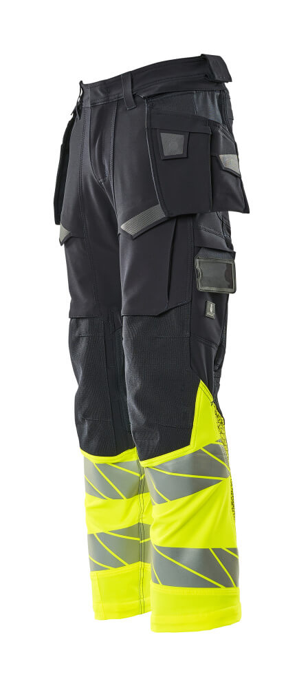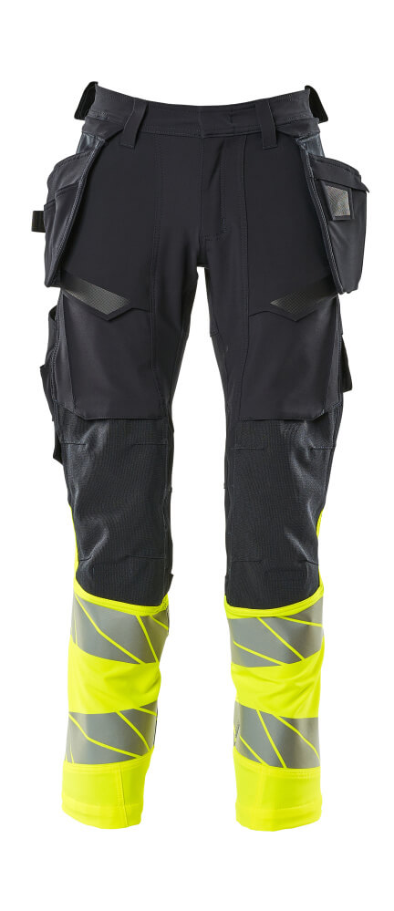 Couleur fluorescente et contrastée avec bandes rétroréfléchissantes. Offre une finition hydrofuge. Bicolore. Tissu ultimate stretch de poids léger et résistant. Coutures doubles sur les jambes et dans l'entrejambe. Fermeture bouton dissimulée. Jambes ergonomiques. Poches flottantes amovibles. Poche flottante interne fermeture avec boutons-pression. Poche flottante avec poche téléphone doublée et fermeture aimantée. Poches flottantes avec renforts en Kevlar® et CORDURA®. Passants de ceinture. Patte-outils de chaque côté de la taille. Braguette zippée. Poches latérales. Poches arrière renforcées et rabat. Patte-marteau cachée de chaque côté. Bouton (amovible) où fixer un porte-couteau. Poche mètre pliant renforcée en Kevlar®. Poches à rabat à l'avant des cuisses. Poches genouillères en CORDURA® de tissu stretch avec ventilation. Réglage facile de la hauteur de la poche genouillère. Poche cuisse avec poche téléphone doublée, fermeture aimantée et porte-badge intégré. Porte-badge amovible. Zip de ventilation vertical à l'arrière des cuisses. Avec effets d'impression. Longueur d'entrejambe pouvant être rallongée de 3 cm en défaisant la couture rouge à l'intérieur vers le pied. Double certification compatible avec le modèle de genouillères large selon la norme EN 14404-3.