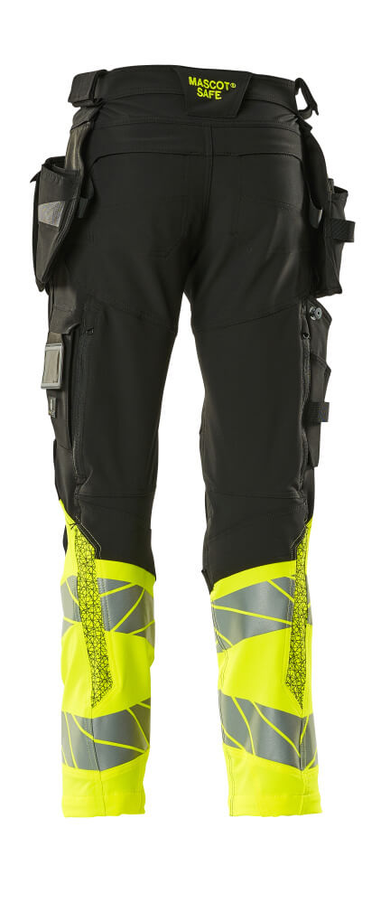 Couleur fluorescente et contrastée avec bandes rétroréfléchissantes. Offre une finition hydrofuge. Bicolore. Tissu ultimate stretch de poids léger et résistant. Coutures doubles sur les jambes et dans l'entrejambe. Fermeture bouton dissimulée. Jambes ergonomiques. Poches flottantes amovibles. Poche flottante interne fermeture avec boutons-pression. Poche flottante avec poche téléphone doublée et fermeture aimantée. Poches flottantes avec renforts en Kevlar® et CORDURA®. Passants de ceinture. Patte-outils de chaque côté de la taille. Braguette zippée. Poches latérales. Poches arrière renforcées et rabat. Patte-marteau cachée de chaque côté. Bouton (amovible) où fixer un porte-couteau. Poche mètre pliant renforcée en Kevlar®. Poches à rabat à l'avant des cuisses. Poches genouillères en CORDURA® de tissu stretch avec ventilation. Réglage facile de la hauteur de la poche genouillère. Poche cuisse avec poche téléphone doublée, fermeture aimantée et porte-badge intégré. Porte-badge amovible. Zip de ventilation vertical à l'arrière des cuisses. Avec effets d'impression. Longueur d'entrejambe pouvant être rallongée de 3 cm en défaisant la couture rouge à l'intérieur vers le pied. Double certification compatible avec le modèle de genouillères large selon la norme EN 14404-3.