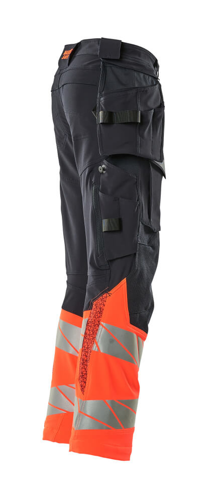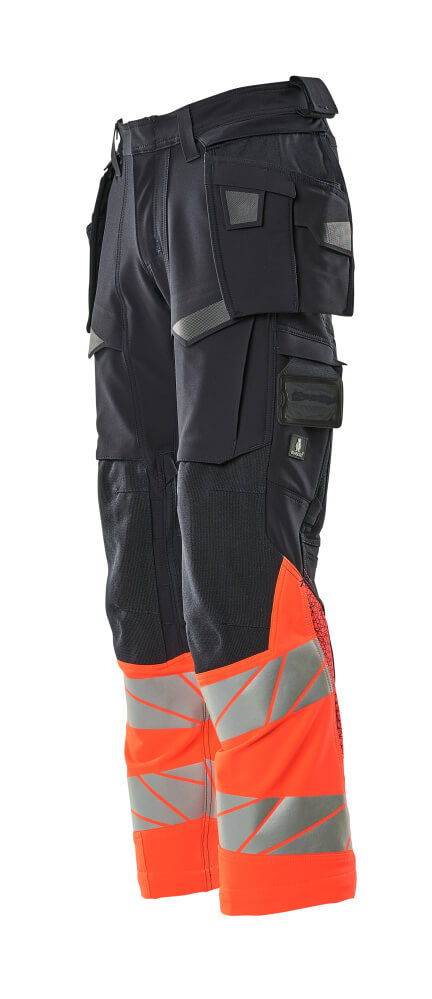 Couleur fluorescente et contrastée avec bandes rétroréfléchissantes. Offre une finition hydrofuge. Bicolore. Tissu ultimate stretch de poids léger et résistant. Coutures doubles sur les jambes et dans l'entrejambe. Fermeture bouton dissimulée. Jambes ergonomiques. Poches flottantes amovibles. Poche flottante interne fermeture avec boutons-pression. Poche flottante avec poche téléphone doublée et fermeture aimantée. Poches flottantes avec renforts en Kevlar® et CORDURA®. Passants de ceinture. Patte-outils de chaque côté de la taille. Braguette zippée. Poches latérales. Poches arrière renforcées et rabat. Patte-marteau cachée de chaque côté. Bouton (amovible) où fixer un porte-couteau. Poche mètre pliant renforcée en Kevlar®. Poches à rabat à l'avant des cuisses. Poches genouillères en CORDURA® de tissu stretch avec ventilation. Réglage facile de la hauteur de la poche genouillère. Poche cuisse avec poche téléphone doublée, fermeture aimantée et porte-badge intégré. Porte-badge amovible. Zip de ventilation vertical à l'arrière des cuisses. Avec effets d'impression. Longueur d'entrejambe pouvant être rallongée de 3 cm en défaisant la couture rouge à l'intérieur vers le pied. Double certification compatible avec le modèle de genouillères large selon la norme EN 14404-3.