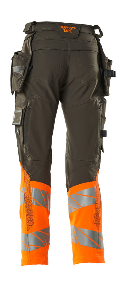 Couleur fluorescente et contrastée avec bandes rétroréfléchissantes. Offre une finition hydrofuge. Bicolore. Tissu ultimate stretch de poids léger et résistant. Coutures doubles sur les jambes et dans l'entrejambe. Fermeture bouton dissimulée. Jambes ergonomiques. Poches flottantes amovibles. Poche flottante interne fermeture avec boutons-pression. Poche flottante avec poche téléphone doublée et fermeture aimantée. Poches flottantes avec renforts en Kevlar® et CORDURA®. Passants de ceinture. Patte-outils de chaque côté de la taille. Braguette zippée. Poches latérales. Poches arrière renforcées et rabat. Patte-marteau cachée de chaque côté. Bouton (amovible) où fixer un porte-couteau. Poche mètre pliant renforcée en Kevlar®. Poches à rabat à l'avant des cuisses. Poches genouillères en CORDURA® de tissu stretch avec ventilation. Réglage facile de la hauteur de la poche genouillère. Poche cuisse avec poche téléphone doublée, fermeture aimantée et porte-badge intégré. Porte-badge amovible. Zip de ventilation vertical à l'arrière des cuisses. Avec effets d'impression. Longueur d'entrejambe pouvant être rallongée de 3 cm en défaisant la couture rouge à l'intérieur vers le pied. Double certification compatible avec le modèle de genouillères large selon la norme EN 14404-3.