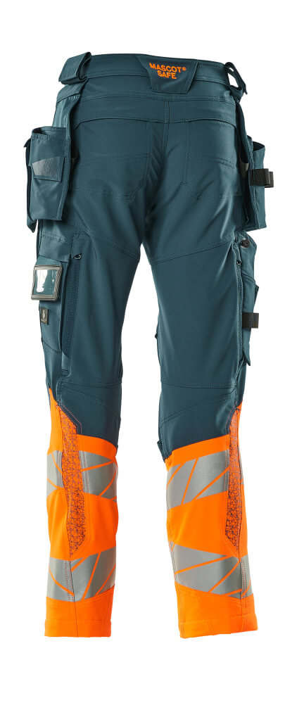 Couleur fluorescente et contrastée avec bandes rétroréfléchissantes. Offre une finition hydrofuge. Bicolore. Tissu ultimate stretch de poids léger et résistant. Coutures doubles sur les jambes et dans l'entrejambe. Fermeture bouton dissimulée. Jambes ergonomiques. Poches flottantes amovibles. Poche flottante interne fermeture avec boutons-pression. Poche flottante avec poche téléphone doublée et fermeture aimantée. Poches flottantes avec renforts en Kevlar® et CORDURA®. Passants de ceinture. Patte-outils de chaque côté de la taille. Braguette zippée. Poches latérales. Poches arrière renforcées et rabat. Patte-marteau cachée de chaque côté. Bouton (amovible) où fixer un porte-couteau. Poche mètre pliant renforcée en Kevlar®. Poches à rabat à l'avant des cuisses. Poches genouillères en CORDURA® de tissu stretch avec ventilation. Réglage facile de la hauteur de la poche genouillère. Poche cuisse avec poche téléphone doublée, fermeture aimantée et porte-badge intégré. Porte-badge amovible. Zip de ventilation vertical à l'arrière des cuisses. Avec effets d'impression. Longueur d'entrejambe pouvant être rallongée de 3 cm en défaisant la couture rouge à l'intérieur vers le pied. Double certification compatible avec le modèle de genouillères large selon la norme EN 14404-3.