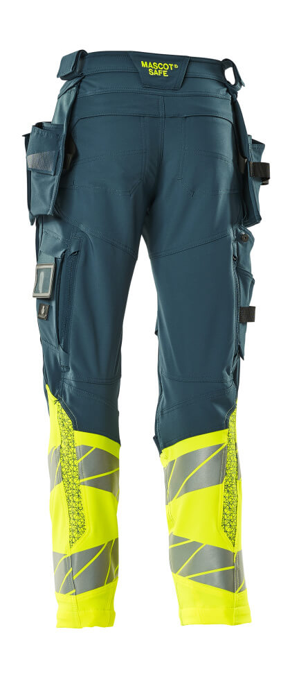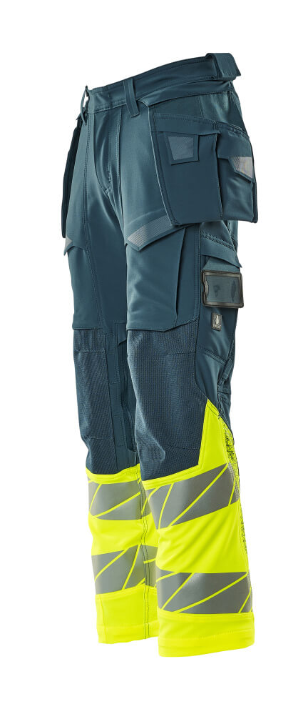 Couleur fluorescente et contrastée avec bandes rétroréfléchissantes. Offre une finition hydrofuge. Bicolore. Tissu ultimate stretch de poids léger et résistant. Coutures doubles sur les jambes et dans l'entrejambe. Fermeture bouton dissimulée. Jambes ergonomiques. Poches flottantes amovibles. Poche flottante interne fermeture avec boutons-pression. Poche flottante avec poche téléphone doublée et fermeture aimantée. Poches flottantes avec renforts en Kevlar® et CORDURA®. Passants de ceinture. Patte-outils de chaque côté de la taille. Braguette zippée. Poches latérales. Poches arrière renforcées et rabat. Patte-marteau cachée de chaque côté. Bouton (amovible) où fixer un porte-couteau. Poche mètre pliant renforcée en Kevlar®. Poches à rabat à l'avant des cuisses. Poches genouillères en CORDURA® de tissu stretch avec ventilation. Réglage facile de la hauteur de la poche genouillère. Poche cuisse avec poche téléphone doublée, fermeture aimantée et porte-badge intégré. Porte-badge amovible. Zip de ventilation vertical à l'arrière des cuisses. Avec effets d'impression. Longueur d'entrejambe pouvant être rallongée de 3 cm en défaisant la couture rouge à l'intérieur vers le pied. Double certification compatible avec le modèle de genouillères large selon la norme EN 14404-3.