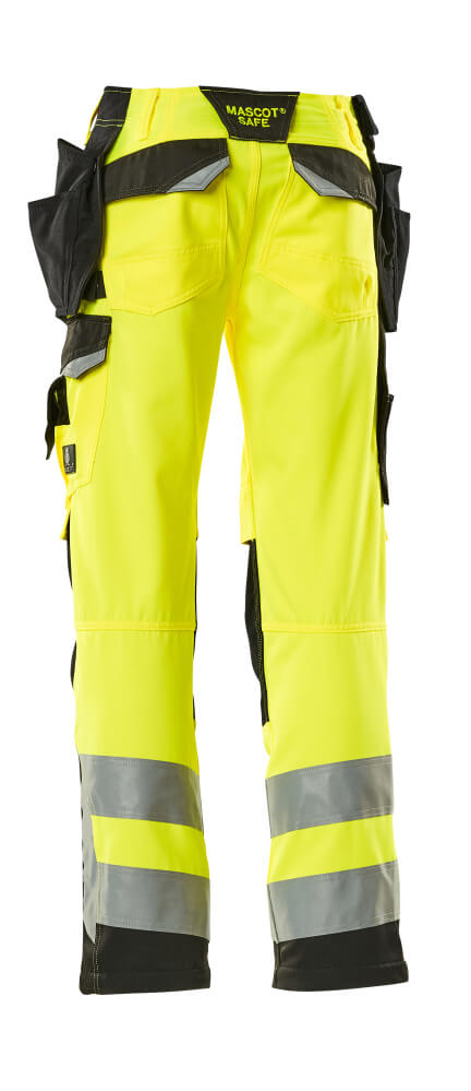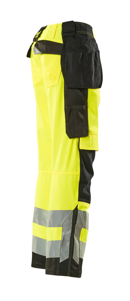 Tissu fluorescent avec bandes rétroréfléchissantes. Bicolore. Le traitement de surface rend votre vêtement moins salissant. Coutures triples sur les jambes et dans l'entrejambe. Taille basse et ceinture façonnée. Jambes ergonomiques. Poches flottantes réglables en CORDURA® avec des espaces supplémentaires pour les outils. Passants de ceinture. Braguette zippée. Anneau en D. Patte-outils à la ceinture. Poches latérales. Poches arrière renforcées, sous rabat avec boutons-pression invisibles. Patte-marteau réglable. Poche cuisse renforcée et dotée de poches supplémentaires - une poche téléphone intérieure ainsi qu'une extérieure sous rabat avec fermeture aimantée. Poche mètre-pliant avec ouverture renforcée en CORDURA®. Poches genouillères réglables en CORDURA® solide (500 D) sous rabat avec insertion des genouillères par le haut. Bandes rétroréfléchissantes verticales sur le côté des jambes pour une meilleure visibilité. Longueur d'entrejambe pouvant être rallongée de 3 cm en défaisant la couture rouge à l'intérieur vers le pied. Double certification compatible avec le modèle de genouillères large selon la norme EN 14404-3.