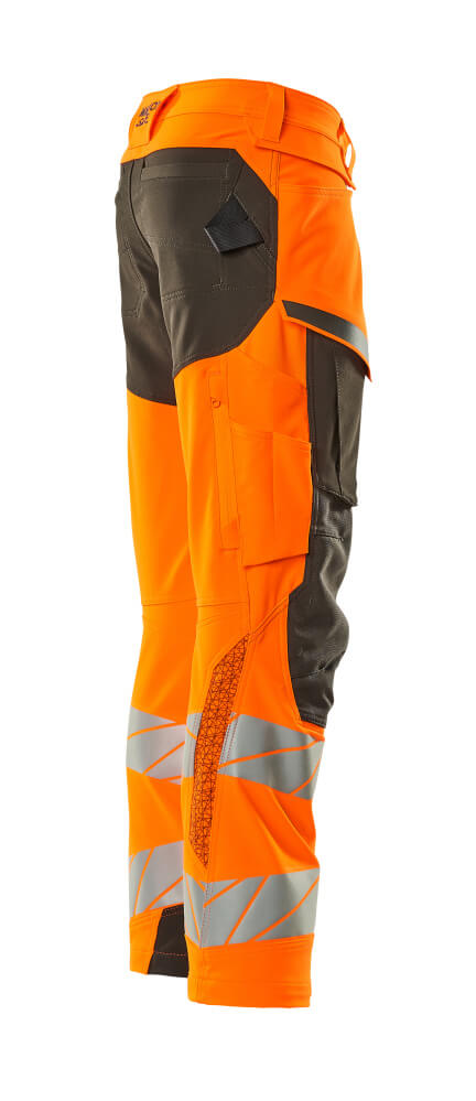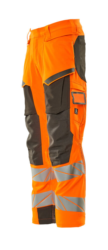 Tissu fluorescent avec bandes rétroréfléchissantes. Offre une finition hydrofuge. Bicolore. Tissu ultimate stretch de poids léger et résistant. Coutures doubles sur les jambes et dans l'entrejambe. Fermeture bouton dissimulée. Jambes ergonomiques. Passants de ceinture. Braguette zippée. Poches latérales. Poches arrière renforcées. Patte-marteau cachée du côté droit. Compatible avec les poches flottantes 19450-126, qui se fixent par boutons. Poche mètre pliant renforcée en Kevlar®. Poches à rabat à l'avant des cuisses. Poches genouillères réglables en CORDURA® particulièrement solides (1000 D). Réglage facile de la hauteur de la poche genouillère. Poche cuisse avec poche pour téléphone doublée, bouton-pression caché et porte-badge intégré. Porte-badge amovible. Zip de ventilation vertical à l'arrière des cuisses. Avec effets d'impression. Longueur d'entrejambe pouvant être rallongée de 3 cm en défaisant la couture rouge à l'intérieur vers le pied. Double certification compatible avec le modèle de genouillères large selon la norme EN 14404-3.