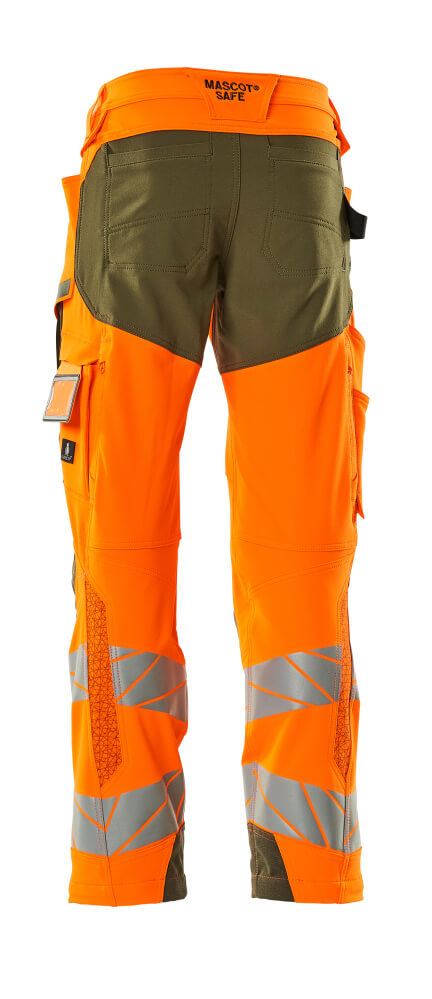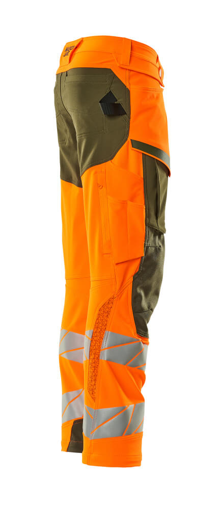 Tissu fluorescent avec bandes rétroréfléchissantes. Offre une finition hydrofuge. Bicolore. Tissu ultimate stretch de poids léger et résistant. Coutures doubles sur les jambes et dans l'entrejambe. Fermeture bouton dissimulée. Jambes ergonomiques. Passants de ceinture. Braguette zippée. Poches latérales. Poches arrière renforcées. Patte-marteau cachée du côté droit. Compatible avec les poches flottantes 19450-126, qui se fixent par boutons. Poche mètre pliant renforcée en Kevlar®. Poches à rabat à l'avant des cuisses. Poches genouillères réglables en CORDURA® particulièrement solides (1000 D). Réglage facile de la hauteur de la poche genouillère. Poche cuisse avec poche pour téléphone doublée, bouton-pression caché et porte-badge intégré. Porte-badge amovible. Zip de ventilation vertical à l'arrière des cuisses. Avec effets d'impression. Longueur d'entrejambe pouvant être rallongée de 3 cm en défaisant la couture rouge à l'intérieur vers le pied. Double certification compatible avec le modèle de genouillères large selon la norme EN 14404-3.