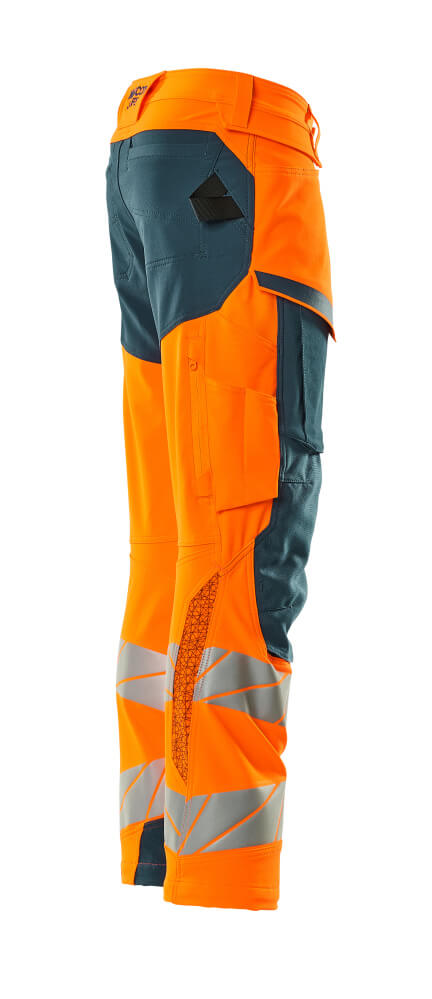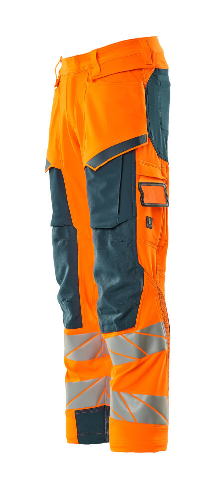 Tissu fluorescent avec bandes rétroréfléchissantes. Offre une finition hydrofuge. Bicolore. Tissu ultimate stretch de poids léger et résistant. Coutures doubles sur les jambes et dans l'entrejambe. Fermeture bouton dissimulée. Jambes ergonomiques. Passants de ceinture. Braguette zippée. Poches latérales. Poches arrière renforcées. Patte-marteau cachée du côté droit. Compatible avec les poches flottantes 19450-126, qui se fixent par boutons. Poche mètre pliant renforcée en Kevlar®. Poches à rabat à l'avant des cuisses. Poches genouillères réglables en CORDURA® particulièrement solides (1000 D). Réglage facile de la hauteur de la poche genouillère. Poche cuisse avec poche pour téléphone doublée, bouton-pression caché et porte-badge intégré. Porte-badge amovible. Zip de ventilation vertical à l'arrière des cuisses. Avec effets d'impression. Longueur d'entrejambe pouvant être rallongée de 3 cm en défaisant la couture rouge à l'intérieur vers le pied. Double certification compatible avec le modèle de genouillères large selon la norme EN 14404-3.