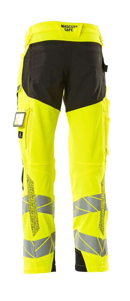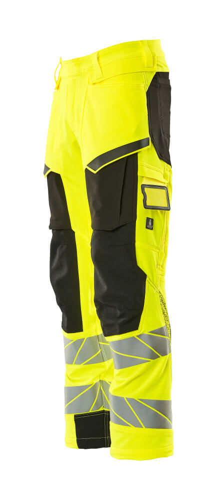 Tissu fluorescent avec bandes rétroréfléchissantes. Offre une finition hydrofuge. Bicolore. Tissu ultimate stretch de poids léger et résistant. Coutures doubles sur les jambes et dans l'entrejambe. Fermeture bouton dissimulée. Jambes ergonomiques. Passants de ceinture. Braguette zippée. Poches latérales. Poches arrière renforcées. Patte-marteau cachée du côté droit. Compatible avec les poches flottantes 19450-126, qui se fixent par boutons. Poche mètre pliant renforcée en Kevlar®. Poches à rabat à l'avant des cuisses. Poches genouillères réglables en CORDURA® particulièrement solides (1000 D). Réglage facile de la hauteur de la poche genouillère. Poche cuisse avec poche pour téléphone doublée, bouton-pression caché et porte-badge intégré. Porte-badge amovible. Zip de ventilation vertical à l'arrière des cuisses. Avec effets d'impression. Longueur d'entrejambe pouvant être rallongée de 3 cm en défaisant la couture rouge à l'intérieur vers le pied. Double certification compatible avec le modèle de genouillères large selon la norme EN 14404-3.