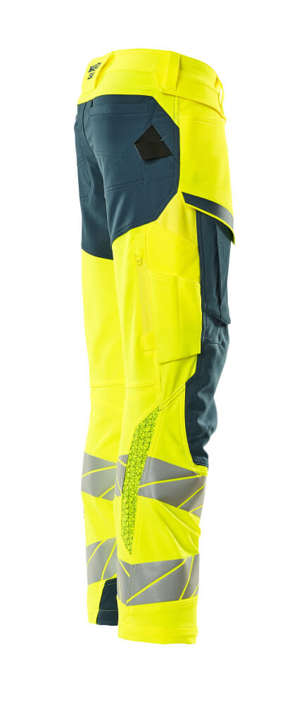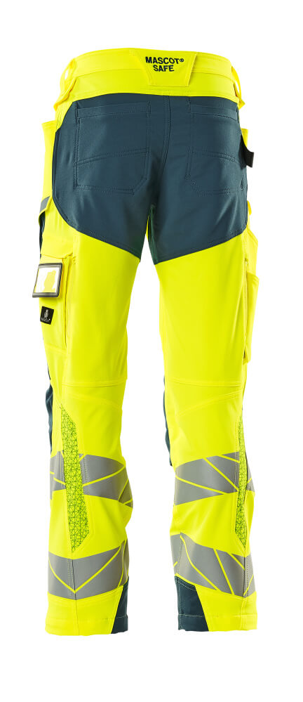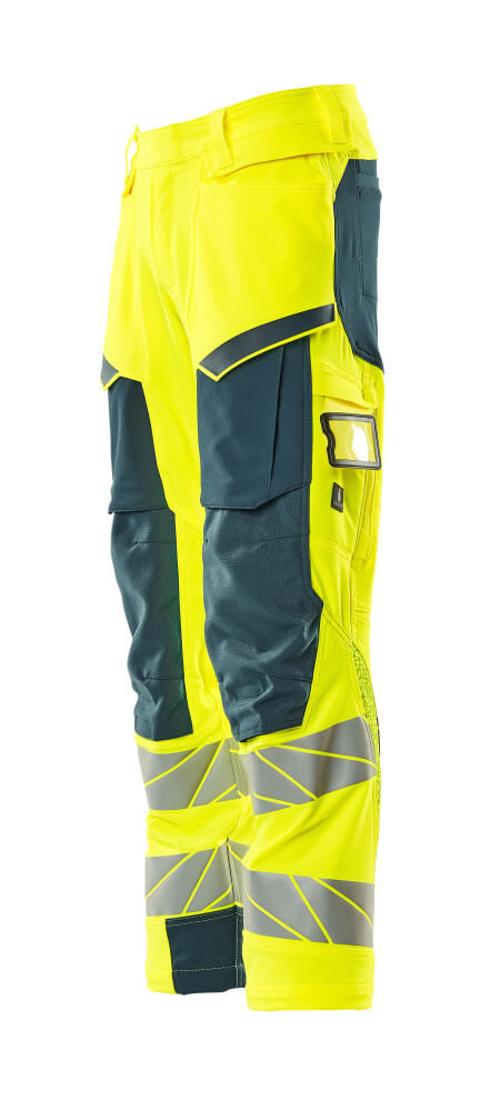 Tissu fluorescent avec bandes rétroréfléchissantes. Offre une finition hydrofuge. Bicolore. Tissu ultimate stretch de poids léger et résistant. Coutures doubles sur les jambes et dans l'entrejambe. Fermeture bouton dissimulée. Jambes ergonomiques. Passants de ceinture. Braguette zippée. Poches latérales. Poches arrière renforcées. Patte-marteau cachée du côté droit. Compatible avec les poches flottantes 19450-126, qui se fixent par boutons. Poche mètre pliant renforcée en Kevlar®. Poches à rabat à l'avant des cuisses. Poches genouillères réglables en CORDURA® particulièrement solides (1000 D). Réglage facile de la hauteur de la poche genouillère. Poche cuisse avec poche pour téléphone doublée, bouton-pression caché et porte-badge intégré. Porte-badge amovible. Zip de ventilation vertical à l'arrière des cuisses. Avec effets d'impression. Longueur d'entrejambe pouvant être rallongée de 3 cm en défaisant la couture rouge à l'intérieur vers le pied. Double certification compatible avec le modèle de genouillères large selon la norme EN 14404-3.