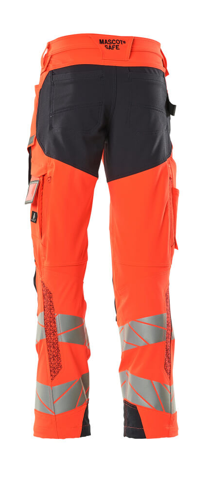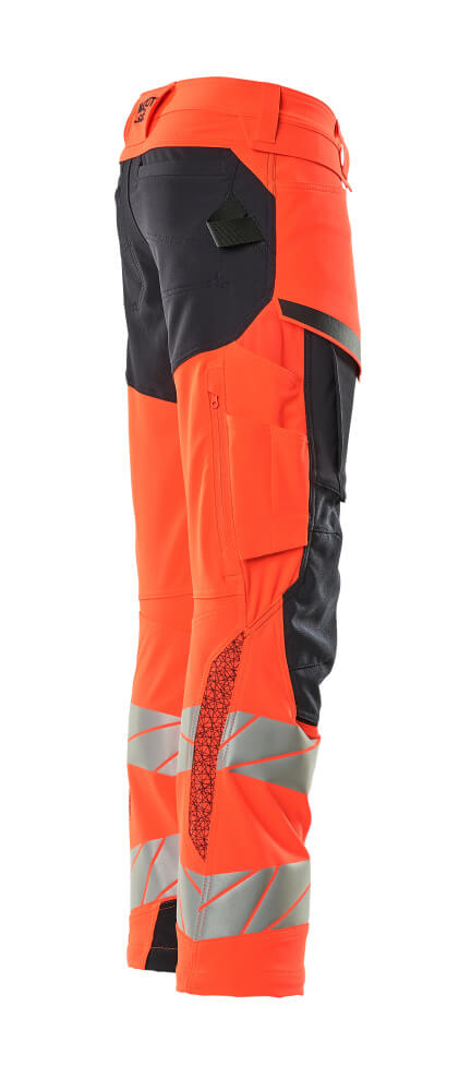 Tissu fluorescent avec bandes rétroréfléchissantes. Offre une finition hydrofuge. Bicolore. Tissu ultimate stretch de poids léger et résistant. Coutures doubles sur les jambes et dans l'entrejambe. Fermeture bouton dissimulée. Jambes ergonomiques. Passants de ceinture. Braguette zippée. Poches latérales. Poches arrière renforcées. Patte-marteau cachée du côté droit. Compatible avec les poches flottantes 19450-126, qui se fixent par boutons. Poche mètre pliant renforcée en Kevlar®. Poches à rabat à l'avant des cuisses. Poches genouillères réglables en CORDURA® particulièrement solides (1000 D). Réglage facile de la hauteur de la poche genouillère. Poche cuisse avec poche pour téléphone doublée, bouton-pression caché et porte-badge intégré. Porte-badge amovible. Zip de ventilation vertical à l'arrière des cuisses. Avec effets d'impression. Longueur d'entrejambe pouvant être rallongée de 3 cm en défaisant la couture rouge à l'intérieur vers le pied. Double certification compatible avec le modèle de genouillères large selon la norme EN 14404-3.