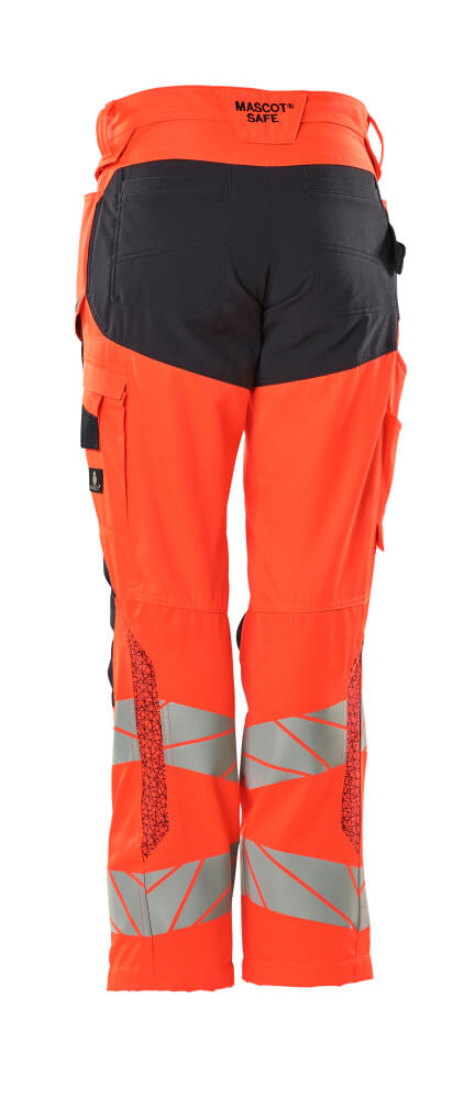 Coupe femme DIAMOND. Tissu fluorescent avec bandes rétroréfléchissantes. Bicolore. Certaines parties du vêtement sont en tissu stretch. Combinaison de tissu léger en qualité 236 et de tissu ULTIMATE STRETCH en qualité 511. Coutures doubles sur les jambes et dans l'entrejambe. Fermeture bouton dissimulée. Fermeture zippée. Jambes ergonomiques. Passants de ceinture. Anneau en D. Poches latérales. Poches arrière renforcées. Patte-marteau cachée du côté droit. Poche mètre pliant renforcée. Poches à rabat à l'avant des cuisses. Poches genouillères réglables en CORDURA® solide (500 D). Réglage facile de la hauteur de la poche genouillère. Poche cuisse avec compartiment téléphone - rabat avec boutons-pression non visibles/recouverts. Avec effets d'impression. Compatible avec les poches flottantes 19450-126, qui se fixent par boutons. Longueur d'entrejambe pouvant être rallongée de 3 cm en défaisant la couture rouge à l'intérieur vers le pied. Double certification compatible avec le modèle de genouillères large selon la norme EN 14404-3.