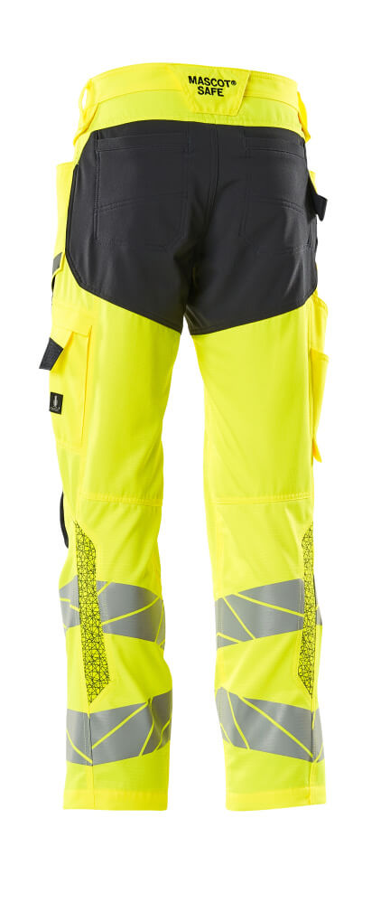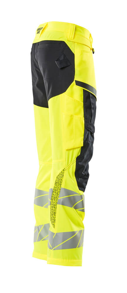 Tissu fluorescent avec bandes rétroréfléchissantes. Bicolore. Certaines parties du vêtement sont en tissu stretch. Combinaison de tissu léger en qualité 236 et de tissu ULTIMATE STRETCH en qualité 511. Coutures doubles sur les jambes et dans l'entrejambe. Fermeture bouton dissimulée. Jambes ergonomiques. Passants de ceinture. Anneau en D. Braguette zippée. Poches latérales. Poches arrière renforcées. Patte-marteau cachée du côté droit. Poche mètre pliant renforcée. Poches à rabat à l'avant des cuisses. Poches genouillères réglables en CORDURA® solide (500 D). Réglage facile de la hauteur de la poche genouillère. Poche cuisse avec compartiment téléphone - rabat avec boutons-pression non visibles/recouverts. Avec effets d'impression. Compatible avec les poches flottantes 19450-126, qui se fixent par boutons. Longueur d'entrejambe pouvant être rallongée de 3 cm en défaisant la couture rouge à l'intérieur vers le pied. Double certification compatible avec le modèle de genouillères large selon la norme EN 14404-3.