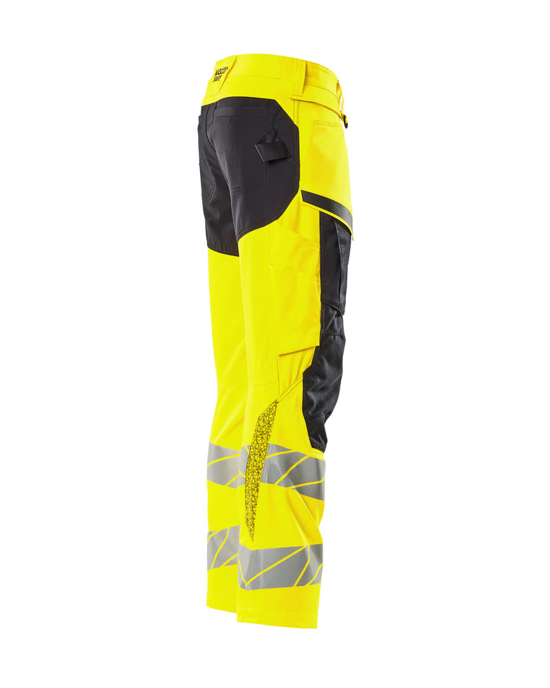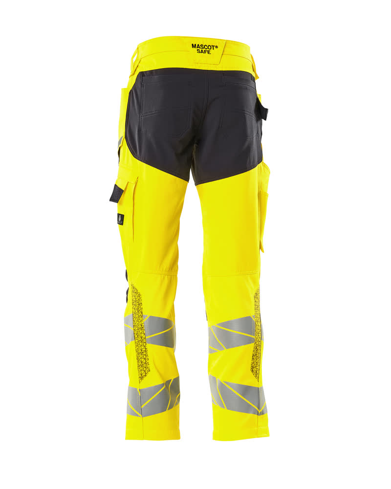 Tissu fluorescent avec bandes rétroréfléchissantes. Bicolore. Certaines parties du vêtement sont en tissu stretch. Combinaison de tissu léger en qualité 236 et de tissu ULTIMATE STRETCH en qualité 511. Coutures doubles sur les jambes et dans l'entrejambe. Fermeture bouton dissimulée. Jambes ergonomiques. Passants de ceinture. Anneau en D. Braguette zippée. Poches latérales. Poches arrière renforcées. Patte-marteau cachée du côté droit. Poche mètre pliant renforcée. Poches à rabat à l'avant des cuisses. Poches genouillères réglables en CORDURA® solide (500 D). Réglage facile de la hauteur de la poche genouillère. Poche cuisse avec compartiment téléphone - rabat avec boutons-pression non visibles/recouverts. Avec effets d'impression. Compatible avec les poches flottantes 19450-126, qui se fixent par boutons. Longueur d'entrejambe pouvant être rallongée de 3 cm en défaisant la couture rouge à l'intérieur vers le pied. Double certification compatible avec le modèle de genouillères large selon la norme EN 14404-3.