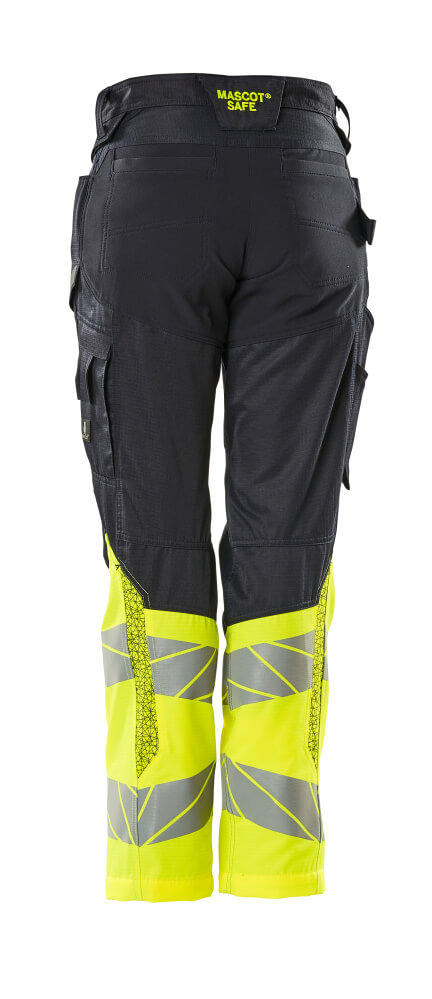 Coupe femme DIAMOND. Couleur fluorescente et contrastée avec bandes rétroréfléchissantes. Bicolore. Certaines parties du vêtement sont en tissu stretch. Combinaison de tissu léger en qualité 236 et de tissu ULTIMATE STRETCH en qualité 511. Coutures doubles sur les jambes et dans l'entrejambe. Fermeture bouton dissimulée. Fermeture zippée. Jambes ergonomiques. Passants de ceinture. Anneau en D. Poches latérales. Poches arrière renforcées. Patte-marteau cachée du côté droit. Poche mètre pliant renforcée. Poches à rabat à l'avant des cuisses. Poches genouillères réglables en CORDURA® solide (500 D). Réglage facile de la hauteur de la poche genouillère. Poche cuisse avec compartiment téléphone - rabat avec boutons-pression non visibles/recouverts. Avec effets d'impression. Compatible avec les poches flottantes 19450-126, qui se fixent par boutons. Longueur d'entrejambe pouvant être rallongée de 3 cm en défaisant la couture rouge à l'intérieur vers le pied. Double certification compatible avec le modèle de genouillères large selon la norme EN 14404-3.