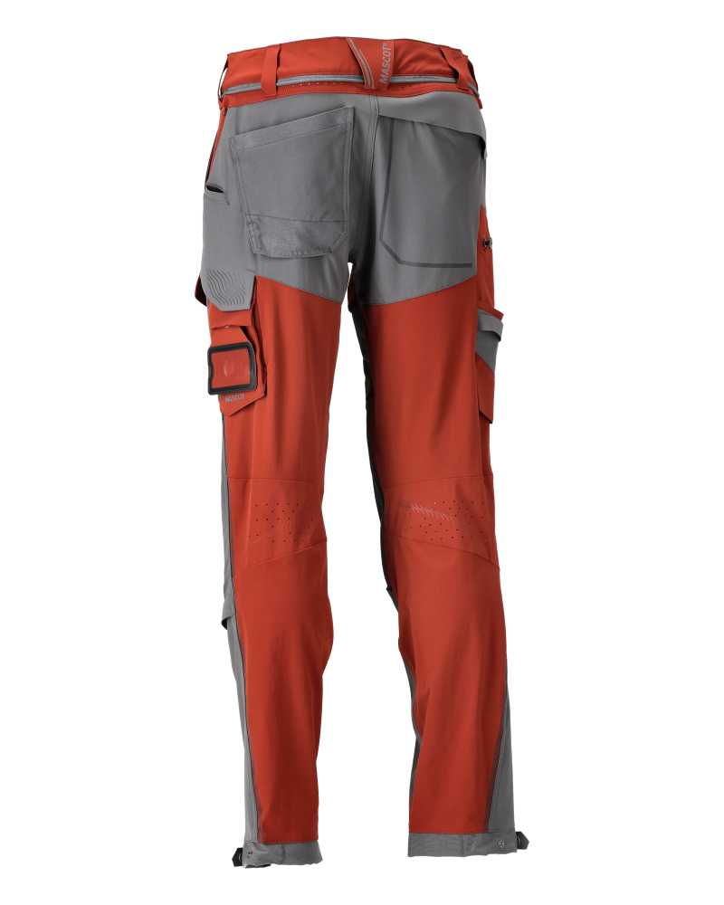 Offre une finition hydrofuge. Tissu ultimate stretch de poids léger et ultrarésistant. Tissu quasiment insensible au contact de la peau grâce aux poches intégrées dans le design. Coutures doubles sur les jambes et dans l'entrejambe. Taille basse. Jambes ergonomiques. Passants de ceinture. Braguette zippée. Poches latérales. Poches arrière. Poche cuisse avec compartiment téléphone. Poche mètre-pliant en CORDURA® contenant des poches supplémentaires. Les poches genouillères sont en CORDURA® particulièrement solides (500 D). Effets rétroréfléchissants. Double certification compatible avec le modèle de genouillères large selon la norme EN 14404-3.