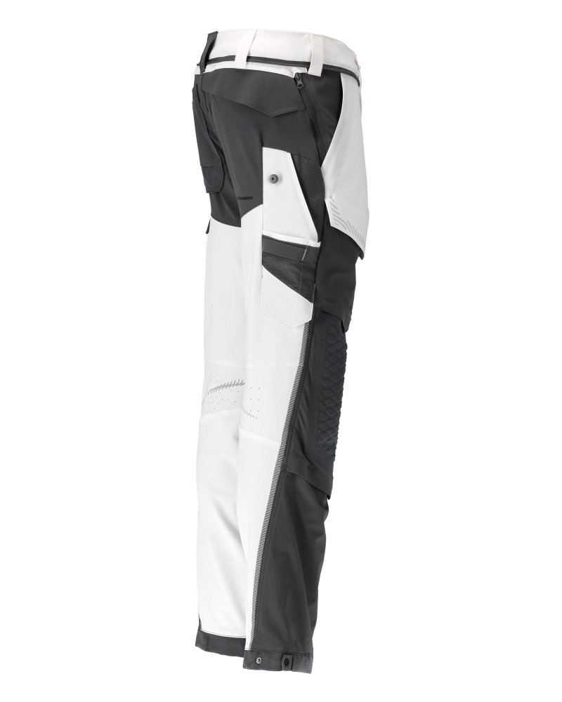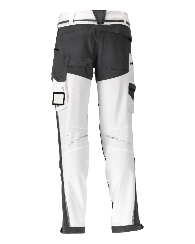 Tissu ultimate stretch de poids léger et ultrarésistant. Offre une finition hydrofuge. Compatible avec les poches flottantes dotées du Click Pocket System. Coutures doubles sur les jambes et triples dans l'entrejambe. Jambes ergonomiques. Perforations à l'arrière du genou et de la taille pour une bonne ventilation. Passants de ceinture. Patte-marteau cachée du côté gauche. Braguette zippée. Filet de ventilation sur les côtés - ouverture zippée. Poches latérales. Poches arrière, dont une avec rabat. Poche pour mètre-pliant renforcée en CORDURA®, avec une petite poche sur le dessus. Bouton (amovible) où fixer un porte-couteau. Poche cuisse incluant une poche téléphone à fermeture aimantée et un porte badge. Porte-badge amovible. Poches à rabat à l'avant des cuisses. Poches genouillères ajustables en CORDURA® super robuste, avec ventilation. Réglage facile de la hauteur de la poche genouillère. Boutons-pression sur les chevilles. Effets rétroréfléchissants. Double certification compatible avec le modèle de genouillères large selon la norme EN 14404-3.