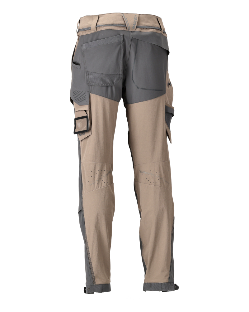 Tissu ultimate stretch de poids léger et ultrarésistant. Offre une finition hydrofuge. Compatible avec les poches flottantes dotées du Click Pocket System. Coutures doubles sur les jambes et triples dans l'entrejambe. Jambes ergonomiques. Perforations à l'arrière du genou et de la taille pour une bonne ventilation. Passants de ceinture. Patte-marteau cachée du côté gauche. Braguette zippée. Filet de ventilation sur les côtés - ouverture zippée. Poches latérales. Poches arrière, dont une avec rabat. Poche pour mètre-pliant renforcée en CORDURA®, avec une petite poche sur le dessus. Bouton (amovible) où fixer un porte-couteau. Poche cuisse incluant une poche téléphone à fermeture aimantée et un porte badge. Porte-badge amovible. Poches à rabat à l'avant des cuisses. Poches genouillères ajustables en CORDURA® super robuste, avec ventilation. Réglage facile de la hauteur de la poche genouillère. Boutons-pression sur les chevilles. Effets rétroréfléchissants. Double certification compatible avec le modèle de genouillères large selon la norme EN 14404-3.