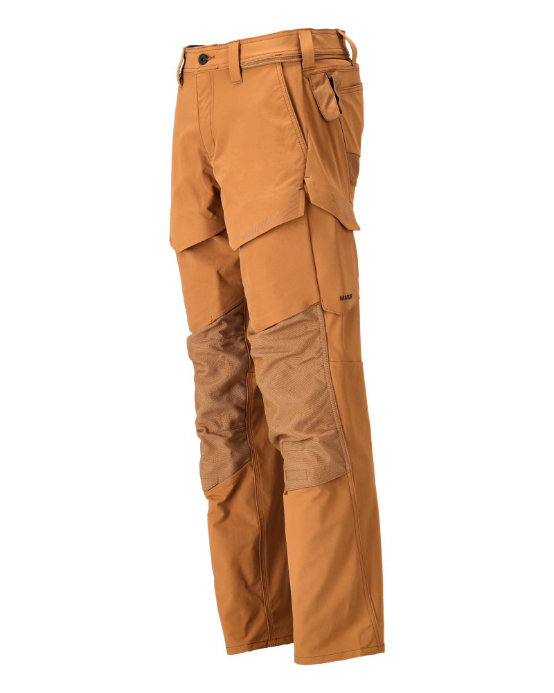 Tissu ultimate stretch de poids léger et ultrarésistant. Offre une finition hydrofuge. Compatible avec les poches flottantes dotées du Click Pocket System. Coutures doubles sur les jambes et triples dans l'entrejambe. Jambes ergonomiques. Passants de ceinture. Braguette zippée. Poches latérales. Poches arrière renforcées. Patte-marteau réglable. Bouton (amovible) où fixer un porte-couteau. Poche pour mètre-pliant renforcée en CORDURA®, avec une petite poche sur le dessus. Poche cuisse avec rabat et fermeture aimantée. Poches à rabat à l'avant des cuisses. Poches genouillères réglables en CORDURA® particulièrement solides (1000 D). Réglage facile de la hauteur de la poche genouillère. Effets rétroréfléchissants. Longueur d'entrejambe pouvant être rallongée de 3 cm en défaisant la couture rouge à l'intérieur vers le pied. Double certification compatible avec le modèle de genouillères large selon la norme EN 14404-3.