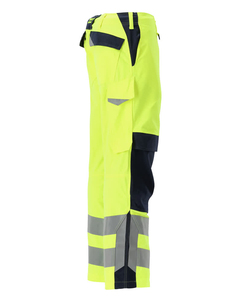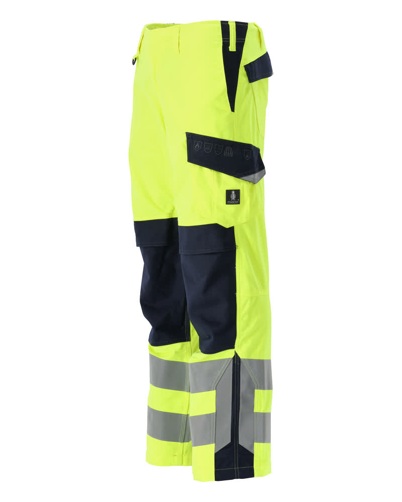 Bicolore. Tissu fluorescent avec bandes rétroréfléchissantes. Antistatique, résistant(e) aux acides et ignifugé(e). Repousse la saleté. Protège contre les arcs électriques et lors de travaux de soudage occasionnels. Coutures doubles sur les jambes et triples dans l'entrejambe. Passants de ceinture. Taille basse et ceinture façonnée. Anneau en D. Braguette zippée. Jambes ergonomiques. Poches latérales. Poches arrière renforcées, sous rabat avec boutons-pression invisibles. Poche cuisse sous rabat avec boutons-pression non visibles/recouverts. Poche téléphone sur la cuisse. Poche mètre pliant sous rabat renforcée. Poches genouillères - sous rabat, réglables et avec insertion des genouillères par le haut. Double certification compatible avec le modèle de genouillères large selon la norme EN 14404-3.
