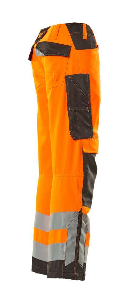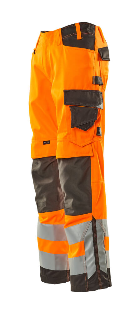 Tissu fluorescent avec bandes rétroréfléchissantes. Bicolore. Le traitement de surface rend votre vêtement moins salissant. Coutures triples sur les jambes et dans l'entrejambe. Taille basse et ceinture façonnée. Jambes ergonomiques. Passants de ceinture. Braguette zippée. Anneau en D. Poches latérales. Poches arrière renforcées, sous rabat avec boutons-pression invisibles. Patte-marteau réglable. Poche cuisse renforcée et dotée de poches supplémentaires - une poche téléphone intérieure ainsi qu'une extérieure sous rabat avec fermeture aimantée. Poche mètre-pliant avec ouverture renforcée en CORDURA®. Poches genouillères réglables en CORDURA® solide (500 D) sous rabat avec insertion des genouillères par le haut. Bandes rétroréfléchissantes verticales sur le côté des jambes pour une meilleure visibilité. Longueur d'entrejambe pouvant être rallongée de 3 cm en défaisant la couture rouge à l'intérieur vers le pied. Double certification compatible avec le modèle de genouillères large selon la norme EN 14404-3.