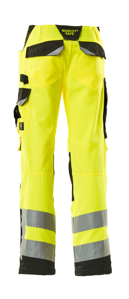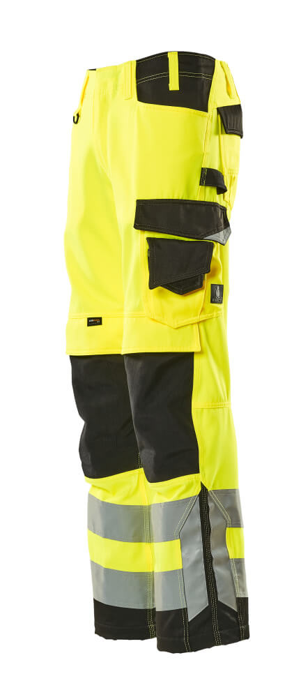 Tissu fluorescent avec bandes rétroréfléchissantes. Bicolore. Le traitement de surface rend votre vêtement moins salissant. Coutures triples sur les jambes et dans l'entrejambe. Taille basse et ceinture façonnée. Jambes ergonomiques. Passants de ceinture. Braguette zippée. Anneau en D. Poches latérales. Poches arrière renforcées, sous rabat avec boutons-pression invisibles. Patte-marteau réglable. Poche cuisse renforcée et dotée de poches supplémentaires - une poche téléphone intérieure ainsi qu'une extérieure sous rabat avec fermeture aimantée. Poche mètre-pliant avec ouverture renforcée en CORDURA®. Poches genouillères réglables en CORDURA® solide (500 D) sous rabat avec insertion des genouillères par le haut. Bandes rétroréfléchissantes verticales sur le côté des jambes pour une meilleure visibilité. Longueur d'entrejambe pouvant être rallongée de 3 cm en défaisant la couture rouge à l'intérieur vers le pied. Double certification compatible avec le modèle de genouillères large selon la norme EN 14404-3.