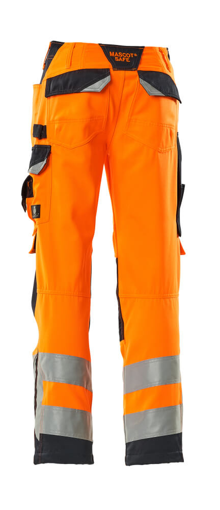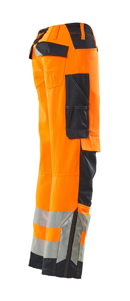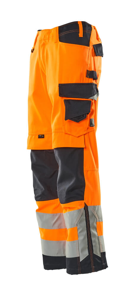 Tissu fluorescent avec bandes rétroréfléchissantes. Bicolore. Le traitement de surface rend votre vêtement moins salissant. Coutures triples sur les jambes et dans l'entrejambe. Taille basse et ceinture façonnée. Jambes ergonomiques. Passants de ceinture. Braguette zippée. Anneau en D. Poches latérales. Poches arrière renforcées, sous rabat avec boutons-pression invisibles. Patte-marteau réglable. Poche cuisse renforcée et dotée de poches supplémentaires - une poche téléphone intérieure ainsi qu'une extérieure sous rabat avec fermeture aimantée. Poche mètre-pliant avec ouverture renforcée en CORDURA®. Poches genouillères réglables en CORDURA® solide (500 D) sous rabat avec insertion des genouillères par le haut. Bandes rétroréfléchissantes verticales sur le côté des jambes pour une meilleure visibilité. Longueur d'entrejambe pouvant être rallongée de 3 cm en défaisant la couture rouge à l'intérieur vers le pied. Double certification compatible avec le modèle de genouillères large selon la norme EN 14404-3.