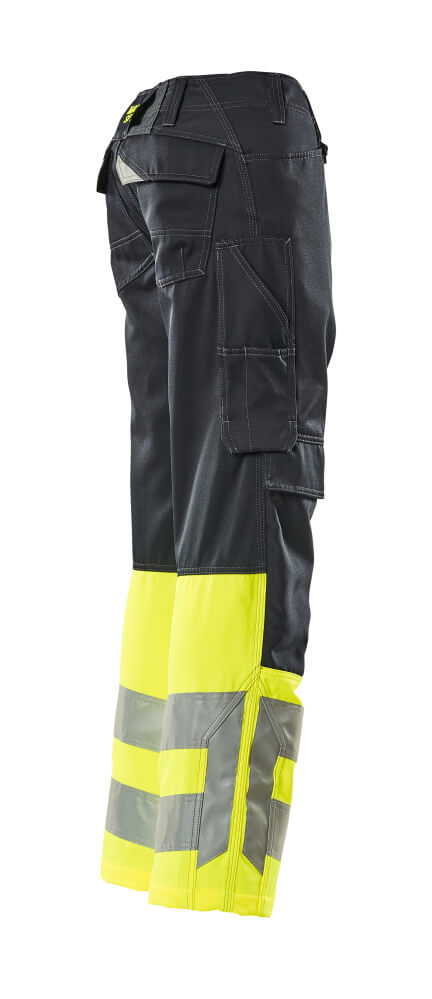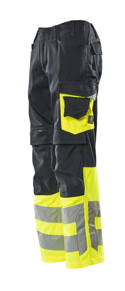 Couleur fluorescente et contrastée avec bandes rétroréfléchissantes. Le traitement de surface rend votre vêtement moins salissant. Bicolore. Coutures triples sur les jambes et dans l'entrejambe. Taille basse et ceinture façonnée. Jambes ergonomiques. Passants de ceinture. Braguette zippée. Anneau en D. Poches latérales. Poches arrière renforcées, sous rabat avec boutons-pression invisibles. Patte-marteau réglable. Poche cuisse renforcée et dotée de poches supplémentaires - une poche téléphone intérieure ainsi qu'une extérieure sous rabat avec fermeture aimantée. Poche mètre-pliant avec ouverture renforcée en CORDURA®. Poches genouillères réglables en CORDURA® solide (500 D) sous rabat avec insertion des genouillères par le haut. Bandes rétroréfléchissantes verticales sur le côté des jambes pour une meilleure visibilité. Longueur d'entrejambe pouvant être rallongée de 3 cm en défaisant la couture rouge à l'intérieur vers le pied. Double certification compatible avec le modèle de genouillères large selon la norme EN 14404-3.