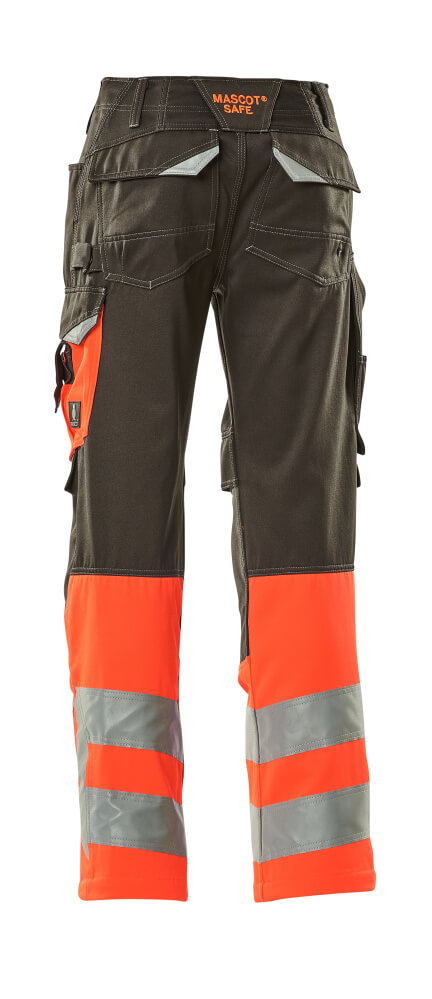 Couleur fluorescente et contrastée avec bandes rétroréfléchissantes. Le traitement de surface rend votre vêtement moins salissant. Bicolore. Coutures triples sur les jambes et dans l'entrejambe. Taille basse et ceinture façonnée. Jambes ergonomiques. Passants de ceinture. Braguette zippée. Anneau en D. Poches latérales. Poches arrière renforcées, sous rabat avec boutons-pression invisibles. Patte-marteau réglable. Poche cuisse renforcée et dotée de poches supplémentaires - une poche téléphone intérieure ainsi qu'une extérieure sous rabat avec fermeture aimantée. Poche mètre-pliant avec ouverture renforcée en CORDURA®. Poches genouillères réglables en CORDURA® solide (500 D) sous rabat avec insertion des genouillères par le haut. Bandes rétroréfléchissantes verticales sur le côté des jambes pour une meilleure visibilité. Longueur d'entrejambe pouvant être rallongée de 3 cm en défaisant la couture rouge à l'intérieur vers le pied. Double certification compatible avec le modèle de genouillères large selon la norme EN 14404-3.