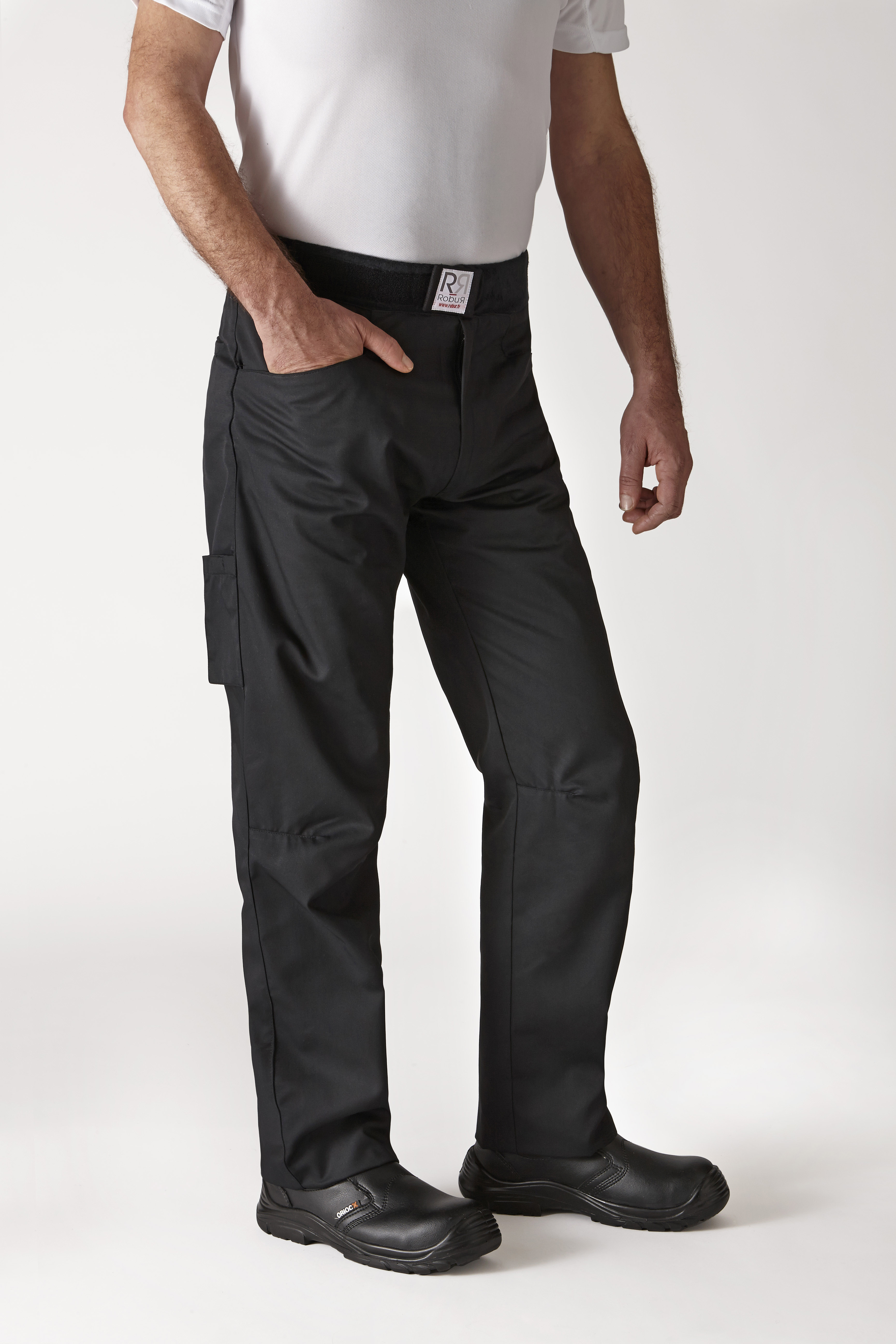 Ceinture élastiquée et recouverte d'éponge Réglage ceinture par bande avec auto agrippant sur le devant Braguette fermée par zip Poches cavalières 1 poche portable fermée par un auto-agrippant sur cuisse 1 poche passepoilée dos Pinces genoux