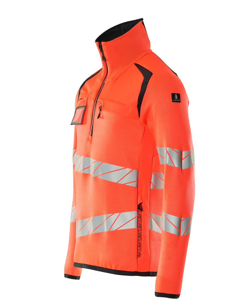 Premium. Fluorescent(e) avec bandes rétroréfléchissantes transversales en biais. Coupe moderne, plus près du corps mais offrant une excellente liberté de mouvement. Col montant. Bicolore. Col zippé sous rabat coupe-vent. Poche poitrine zippée. Poches latérales zippées. Elastiques aux poignets et à la taille. Porte-badge amovible.