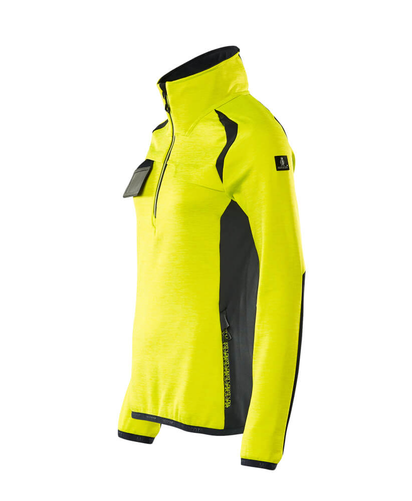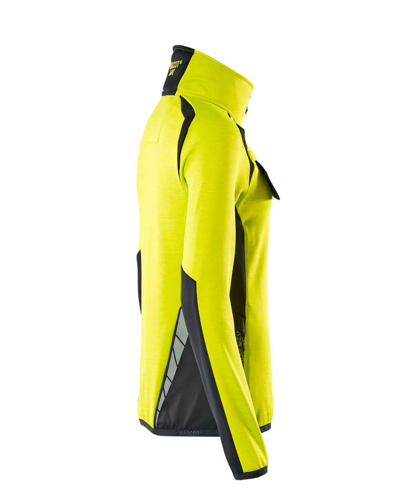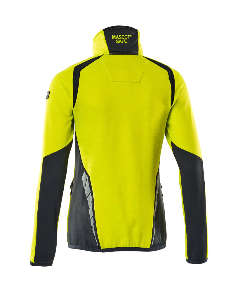 Coupe femme. Coupe moderne, plus près du corps mais offrant une excellente liberté de mouvement. Col montant. Bicolore. Col zippé sous rabat coupe-vent. Poches latérales zippées. Elastiques aux poignets et à la taille. Porte-badge amovible. Effets rétroréfléchissants.