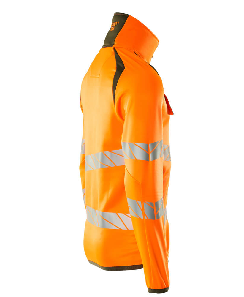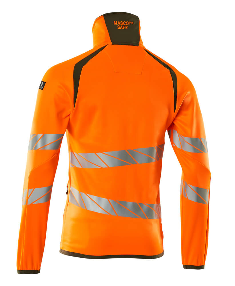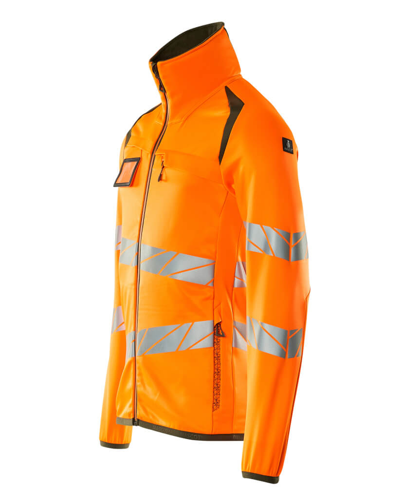 Fluorescent(e) avec bandes rétroréfléchissantes transversales en biais. Coupe moderne, plus près du corps mais offrant une excellente liberté de mouvement. Col montant. Bicolore. Fermeture zippée et rabat coupe-vent à l'intérieur. Poche poitrine zippée. Poches latérales zippées. Poches intérieures. Elastiques aux poignets et à la taille. Porte-badge amovible.
