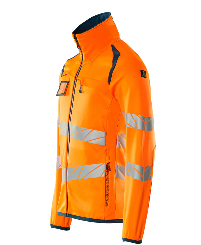 Fluorescent(e) avec bandes rétroréfléchissantes transversales en biais. Coupe moderne, plus près du corps mais offrant une excellente liberté de mouvement. Col montant. Bicolore. Fermeture zippée et rabat coupe-vent à l'intérieur. Poche poitrine zippée. Poches latérales zippées. Poches intérieures. Elastiques aux poignets et à la taille. Porte-badge amovible.