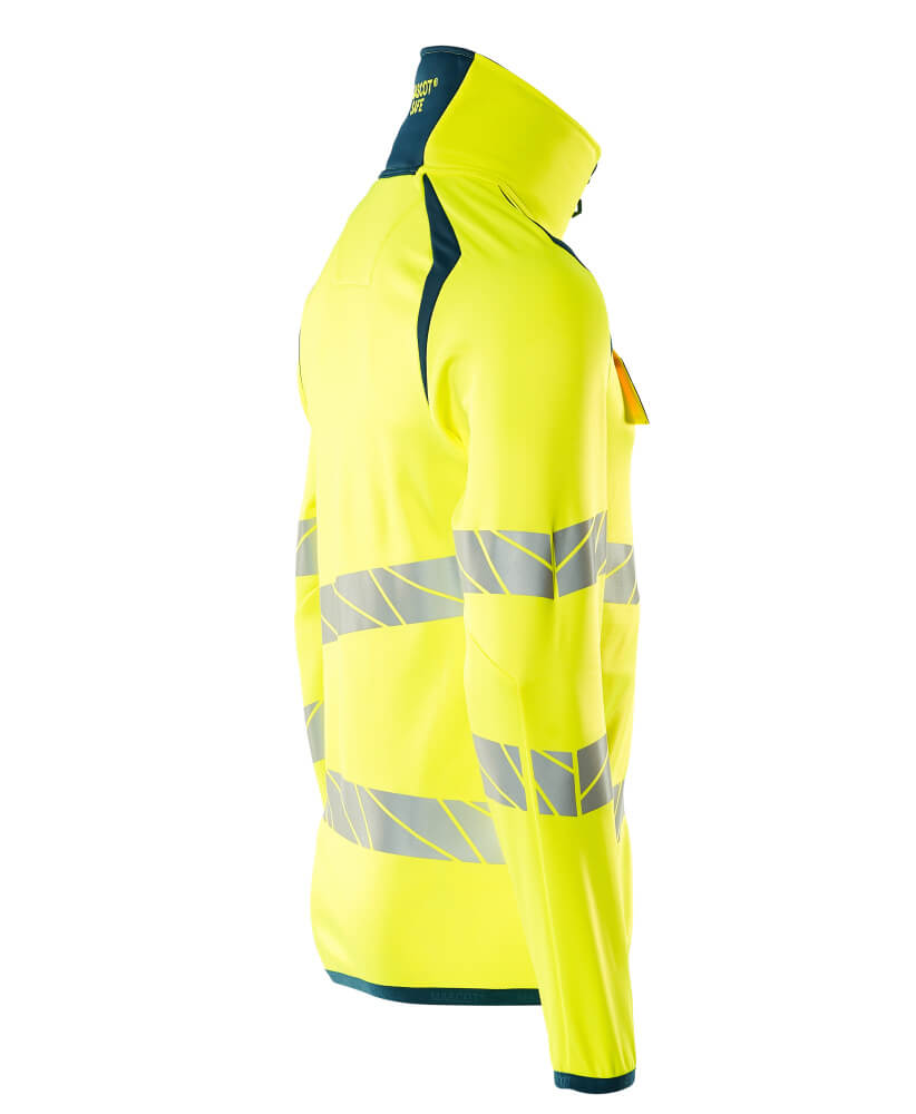 Fluorescent(e) avec bandes rétroréfléchissantes transversales en biais. Coupe moderne, plus près du corps mais offrant une excellente liberté de mouvement. Col montant. Bicolore. Fermeture zippée et rabat coupe-vent à l'intérieur. Poche poitrine zippée. Poches latérales zippées. Poches intérieures. Elastiques aux poignets et à la taille. Porte-badge amovible.