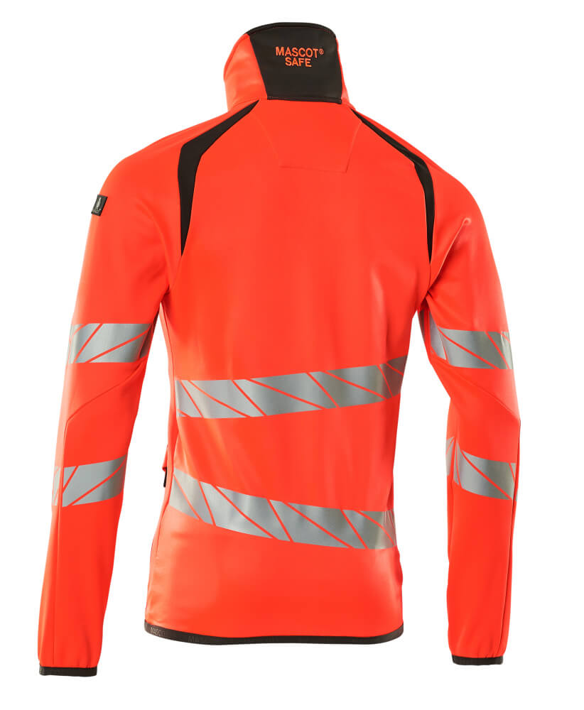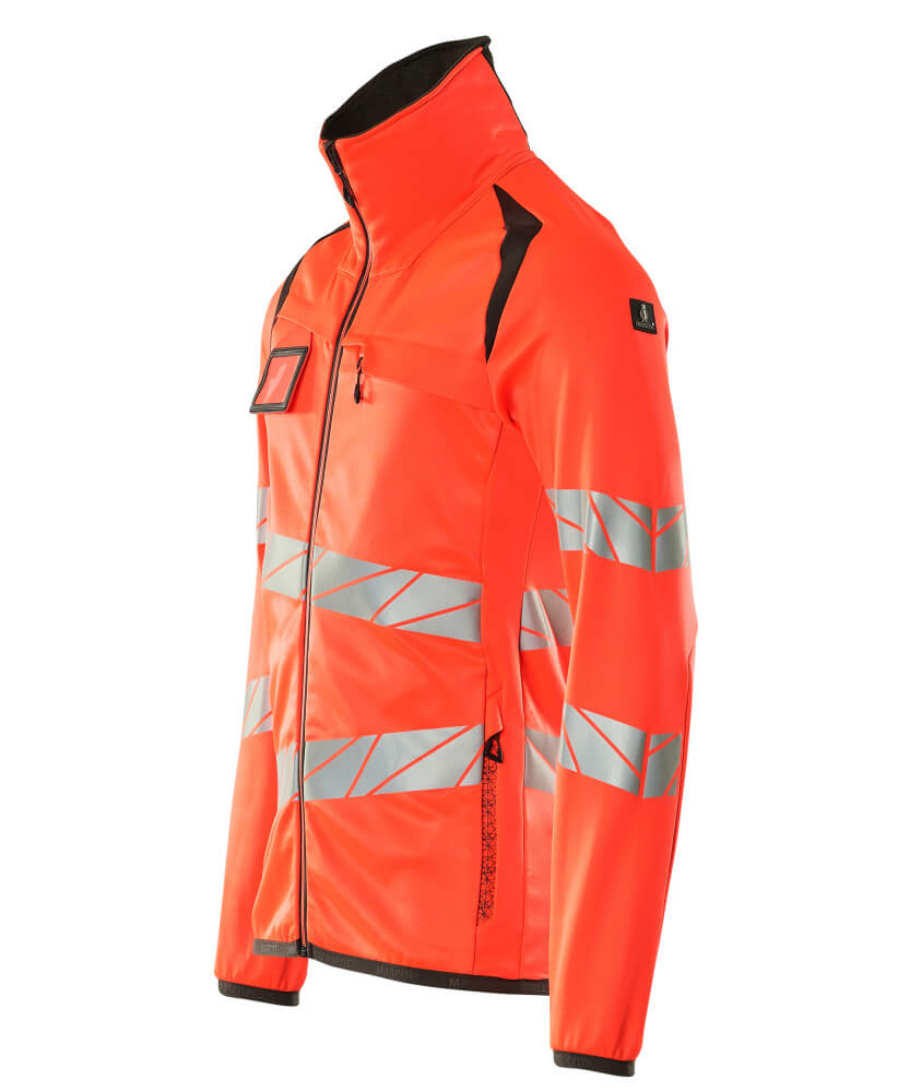 Fluorescent(e) avec bandes rétroréfléchissantes transversales en biais. Coupe moderne, plus près du corps mais offrant une excellente liberté de mouvement. Col montant. Bicolore. Fermeture zippée et rabat coupe-vent à l'intérieur. Poche poitrine zippée. Poches latérales zippées. Poches intérieures. Elastiques aux poignets et à la taille. Porte-badge amovible.
