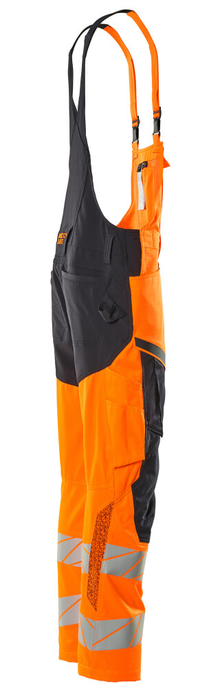 Tissu fluorescent avec bandes rétroréfléchissantes. Bicolore. Certaines parties du vêtement sont en tissu stretch. Combinaison de tissu léger en qualité 236 et de tissu ULTIMATE STRETCH en qualité 511. Coutures doubles sur les jambes et dans l'entrejambe. Jambes ergonomiques. Bretelles ajustables en tissu et court ruban élastique très résistant - boucles en plastique. Les bouts des bretelles peuvent se dissimuler derrière la bavette à l'aide de petites sangles. Poche bavette avec poche stylo, poche téléphone et rabat avec boutons-pression recouverts. Taille réglable. Passants de ceinture. Anneau en D. Braguette zippée. Poches latérales. Poches arrière renforcées. Patte-marteau cachée du côté droit. Poche mètre pliant renforcée. Poches à rabat à l'avant des cuisses. Poches genouillères réglables en CORDURA® solide (500 D). Réglage facile de la hauteur de la poche genouillère. Poche cuisse avec compartiment téléphone - rabat avec boutons-pression non visibles/recouverts. Avec effets d'impression. Longueur d'entrejambe pouvant être rallongée de 3 cm en défaisant la couture rouge à l'intérieur vers le pied. Double certification compatible avec le modèle de genouillères large selon la norme EN 14404-3.