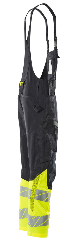 Couleur fluorescente et contrastée avec bandes rétroréfléchissantes. Bicolore. Certaines parties du vêtement sont en tissu stretch. Combinaison de tissu léger en qualité 236 et de tissu ULTIMATE STRETCH en qualité 511. Coutures doubles sur les jambes et dans l'entrejambe. Jambes ergonomiques. Bretelles ajustables en tissu et court ruban élastique très résistant - boucles en plastique. Les bouts des bretelles peuvent se dissimuler derrière la bavette à l'aide de petites sangles. Poche bavette avec poche stylo, poche téléphone et rabat avec boutons-pression recouverts. Taille réglable. Passants de ceinture. Anneau en D. Braguette zippée. Poches latérales. Poches arrière renforcées. Patte-marteau cachée du côté droit. Poche mètre pliant renforcée. Poches à rabat à l'avant des cuisses. Poches genouillères réglables en CORDURA® solide (500 D). Réglage facile de la hauteur de la poche genouillère. Poche cuisse avec compartiment téléphone - rabat avec boutons-pression non visibles/recouverts. Avec effets d'impression. Longueur d'entrejambe pouvant être rallongée de 3 cm en défaisant la couture rouge à l'intérieur vers le pied. Double certification compatible avec le modèle de genouillères large selon la norme EN 14404-3.