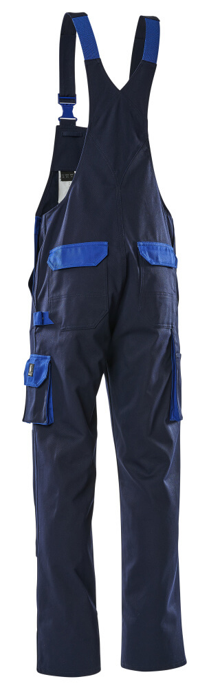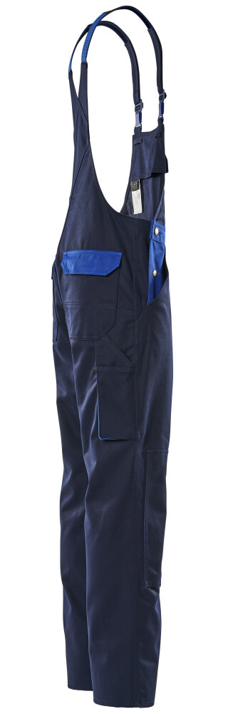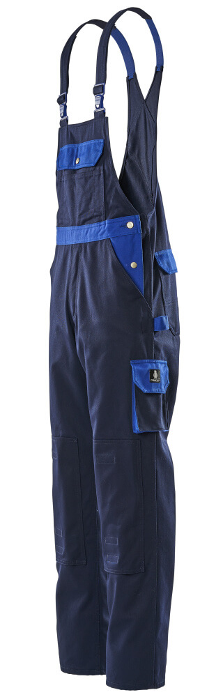 Bicolore. Coutures triples sur les jambes et dans l'entrejambe. Bretelles ajustables en tissu et court ruban élastique très résistant - boucles en plastique. Poche bavette sous rabat, avec poches stylo. Poche intérieure avec fermeture par bande auto-agrippante. Taille réglable. Poches latérales. Braguette zippée. Poches arrière renforcées, avec fermeture par bande auto-agrippante sous rabat. Patte-marteau réglable. Poche cuisse sous rabat fermée par bande auto-agrippante. Poche mètre pliant. Poches genouillères - réglables.