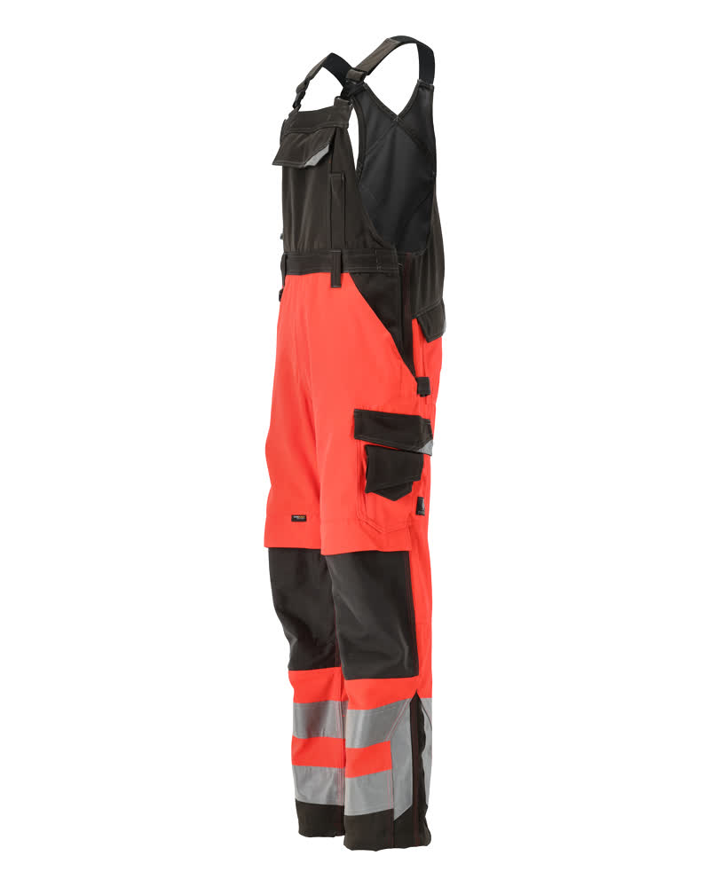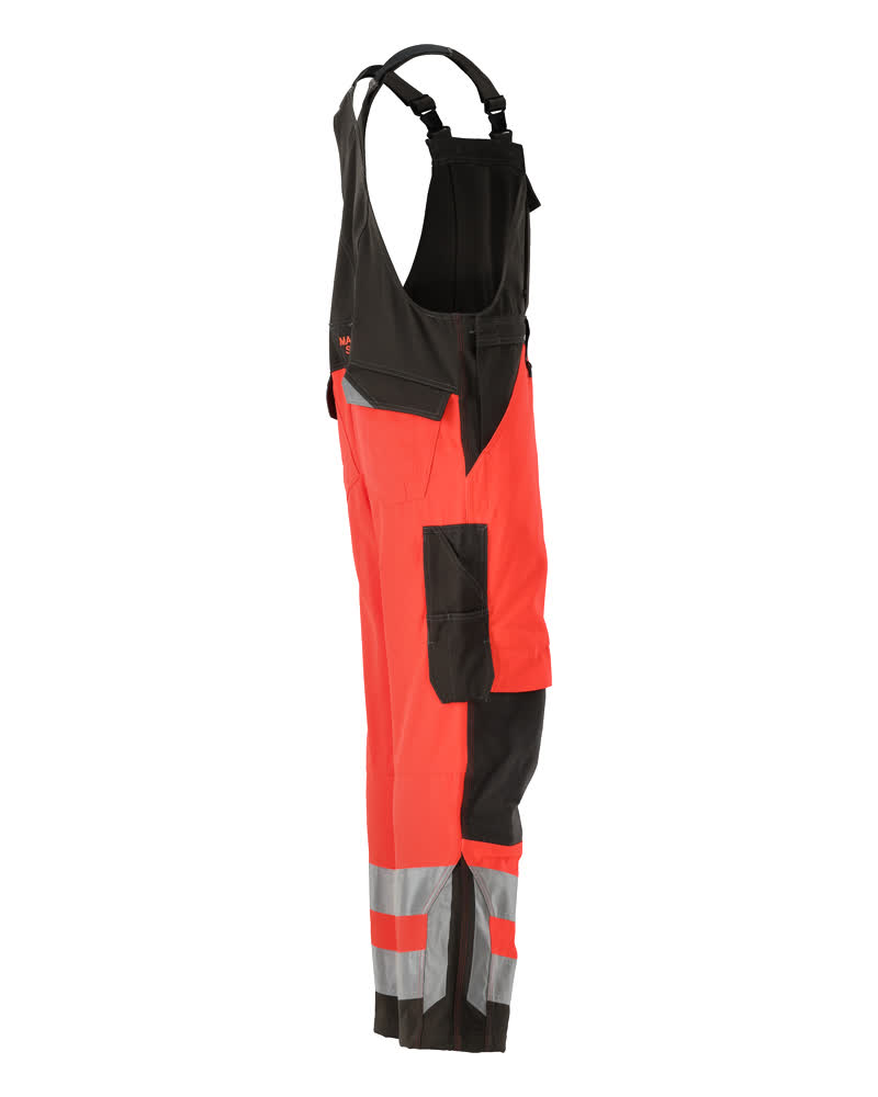 Tissu fluorescent avec bandes rétroréfléchissantes. Bicolore. Le traitement de surface rend votre vêtement moins salissant. Coutures triples sur les jambes et dans l'entrejambe. Jambes ergonomiques. Bretelles ajustables en tissu et court ruban élastique très résistant - boucles en plastique. Les bouts des bretelles peuvent se dissimuler derrière la bavette à l'aide de petites sangles. Poche bavette avec poche stylo, poche téléphone zippée et rabat à boutons pression recouverts. Taille réglable. Passants de ceinture. Braguette zippée. Anneau en D. Poches latérales. Poches arrière renforcées, sous rabat avec boutons-pression invisibles. Patte-marteau réglable. Poche cuisse renforcée et dotée de poches supplémentaires - une poche téléphone intérieure ainsi qu'une extérieure sous rabat avec fermeture aimantée. Poche mètre-pliant avec ouverture renforcée en CORDURA®. Poches genouillères réglables en CORDURA® solide (500 D) sous rabat avec insertion des genouillères par le haut. Bandes rétroréfléchissantes verticales sur le côté des jambes pour une meilleure visibilité. Longueur d'entrejambe pouvant être rallongée de 3 cm en défaisant la couture rouge à l'intérieur vers le pied. Double certification compatible avec le modèle de genouillères large selon la norme EN 14404-3.